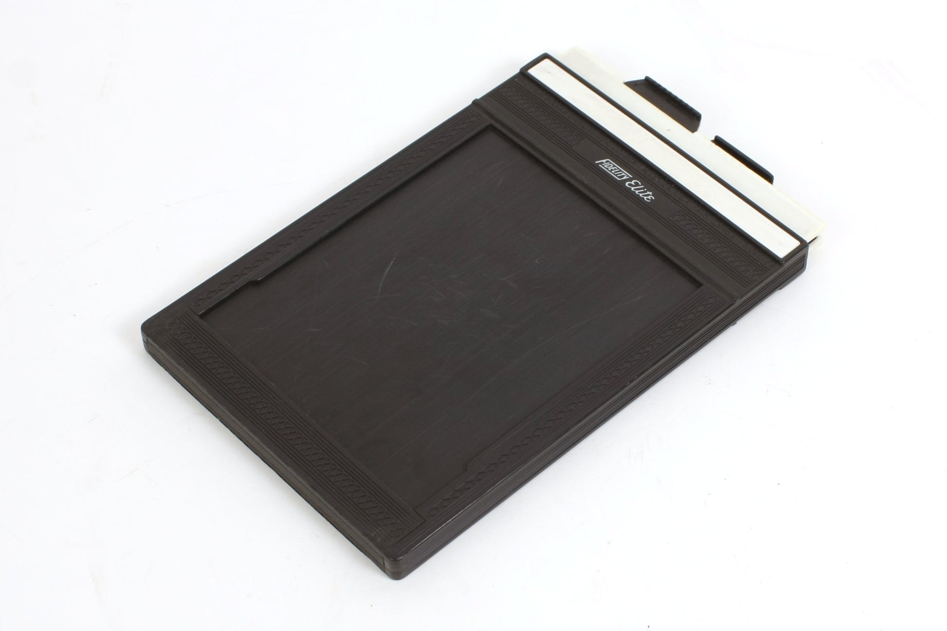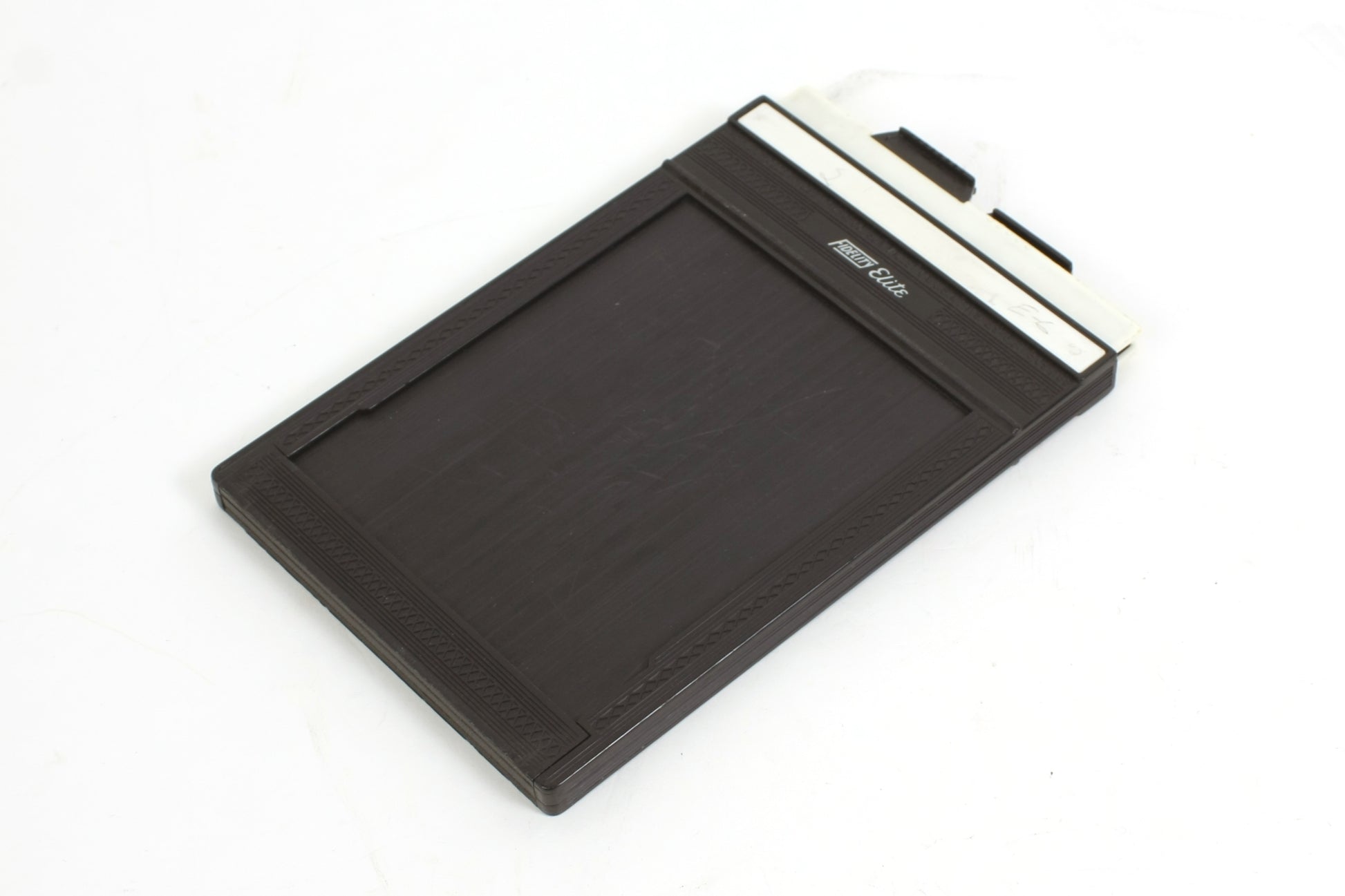 FIDELITY ELITE 4X5 FILM HOLDER. OVERALL MEASUREMENTS APPROXIMATELY 4 3/4 X 7 1/2 INCHES WITH A 3 3/4 X 4 3/4 INCH WINDOW. IN GOOD VINTAGE CONDITION WITH SOME MARKS AND SCRATCHES BUT NO OBVIOUS MAJOR DAMAGE. (MAY VARY SLIGHTLY FROM ITEM SHOWN IN PHOTO).