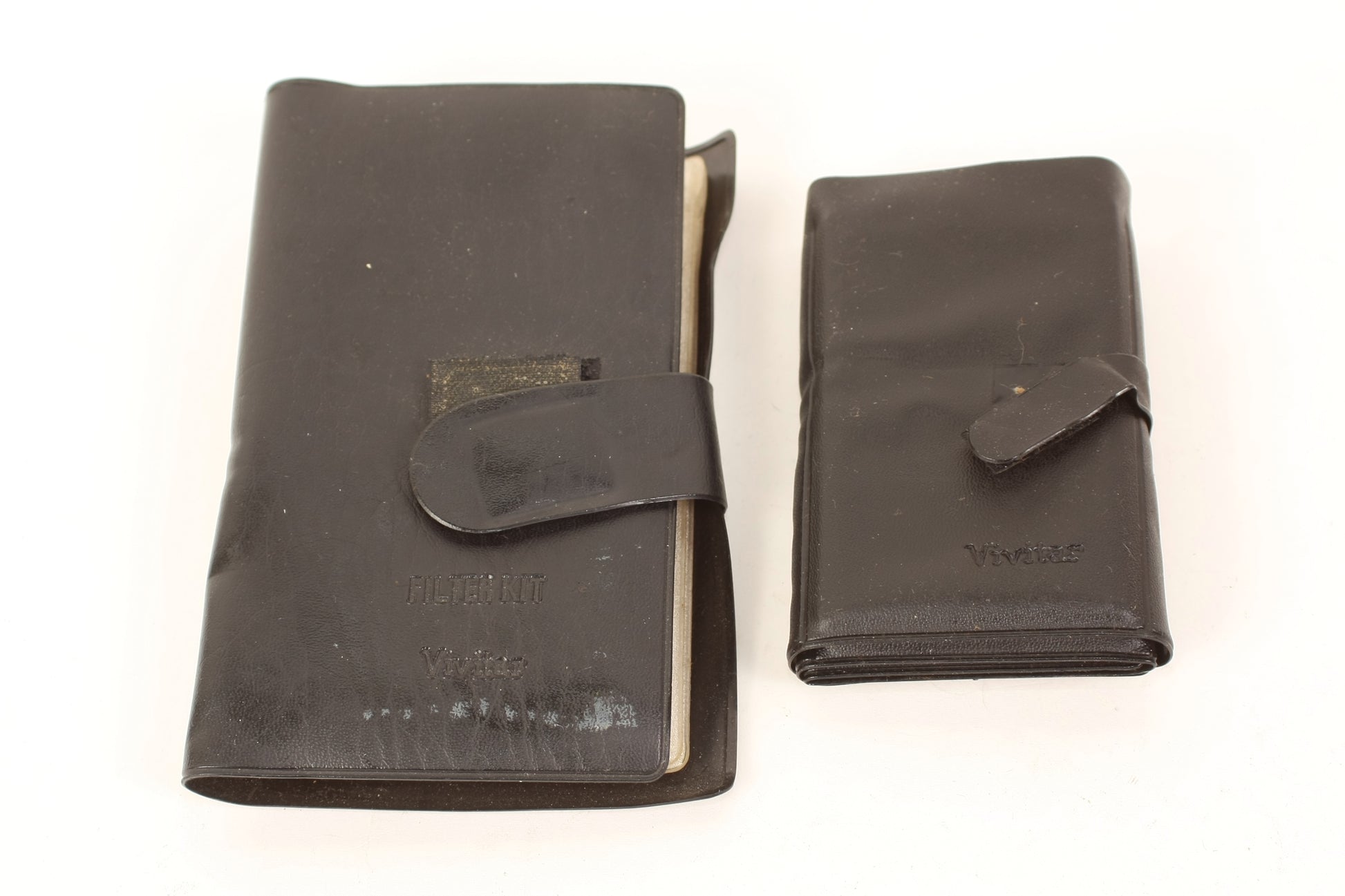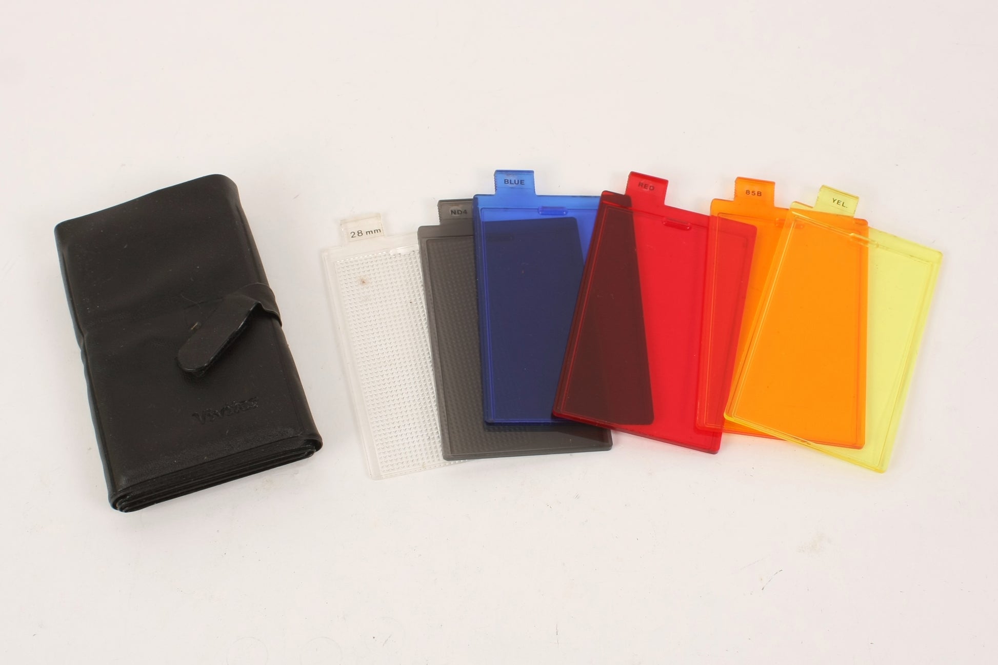 VIVITAR FLASH FILTER KIT FOR MODEL 283 (RED, BLUE, YELLOW, UV, ND4, 85B): SIZE 2 1/4 X 4 1/4 INCHES. THE CASE MEASURES APPROXIMATELY 3 1/2 X 5 3/8 INCHES.