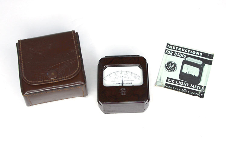 GENERAL ELECTRIC FOOTCANDLES METER. IN WORKING ORDER. SOME LIGHT MARKS AND SCRATCHES BUT OVERALL IN VERY GOOD COSMETIC CONDITION. COMES WITH INSTRUCTIONS AND BROWN LEATHER CASE. SOME CREASING TO THE CASE AND THE METAL POPPER FASTENING IS A LITTLE CORRODED.