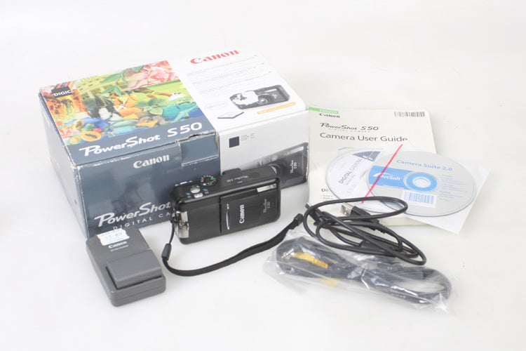 Canon powershot s50 digital camera. In very good used condition. Cosmetically there are only very light marks/signs of use to the body. It appears to be in good working order. The only other items included are: promaster nb-2lh battery, canon cb-2lw battery charger, wrist strap, usb cable, av cable, software cd, instruction manual, and original box.