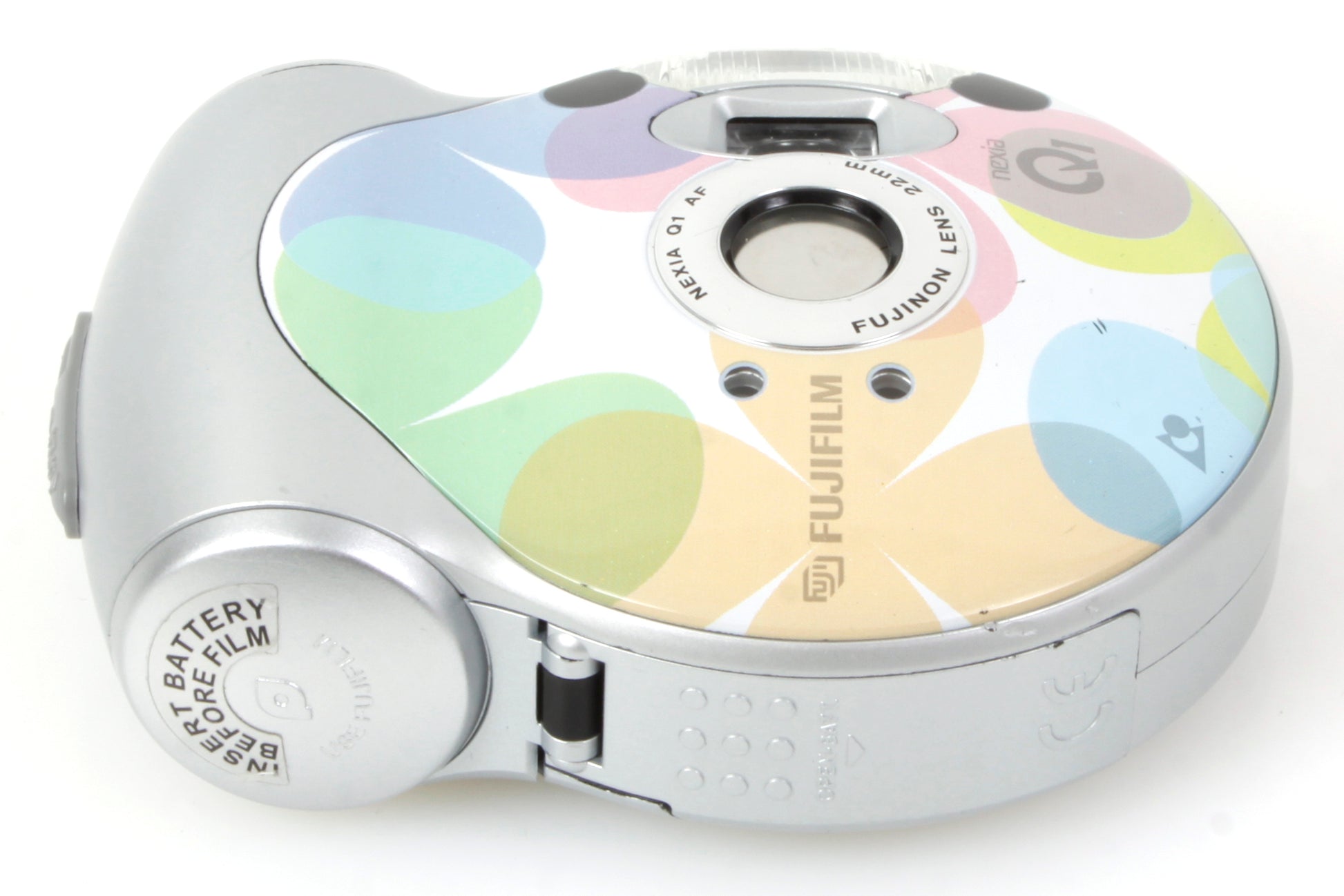 FujiFilm Nexia Q1 camera. In working order, although it has not been tested with film or for accuracy. Cosmetically it is in good vintage condition with some scratches and scuffs. The viewfinder is clear of haze and cracks. Comes with one roll of APS film and one new CR2 battery.