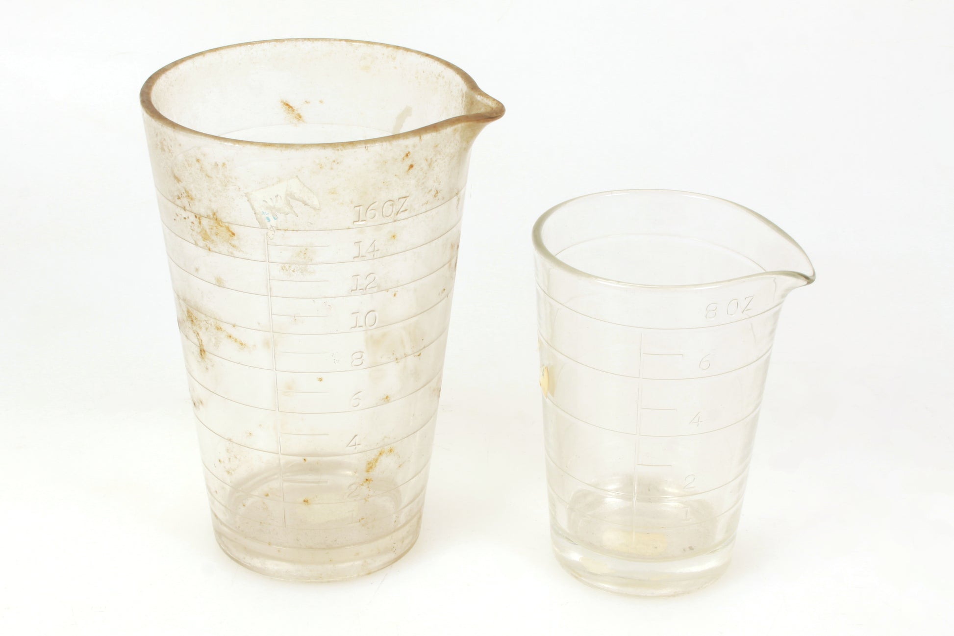 Set of 2 glass measuring cups. The 8oz measures approximately 4 3/8 inches tall and the 16oz 6 inches tall. In good vintage condition with no visible chips or cracks, although they would benefit from cleaning.