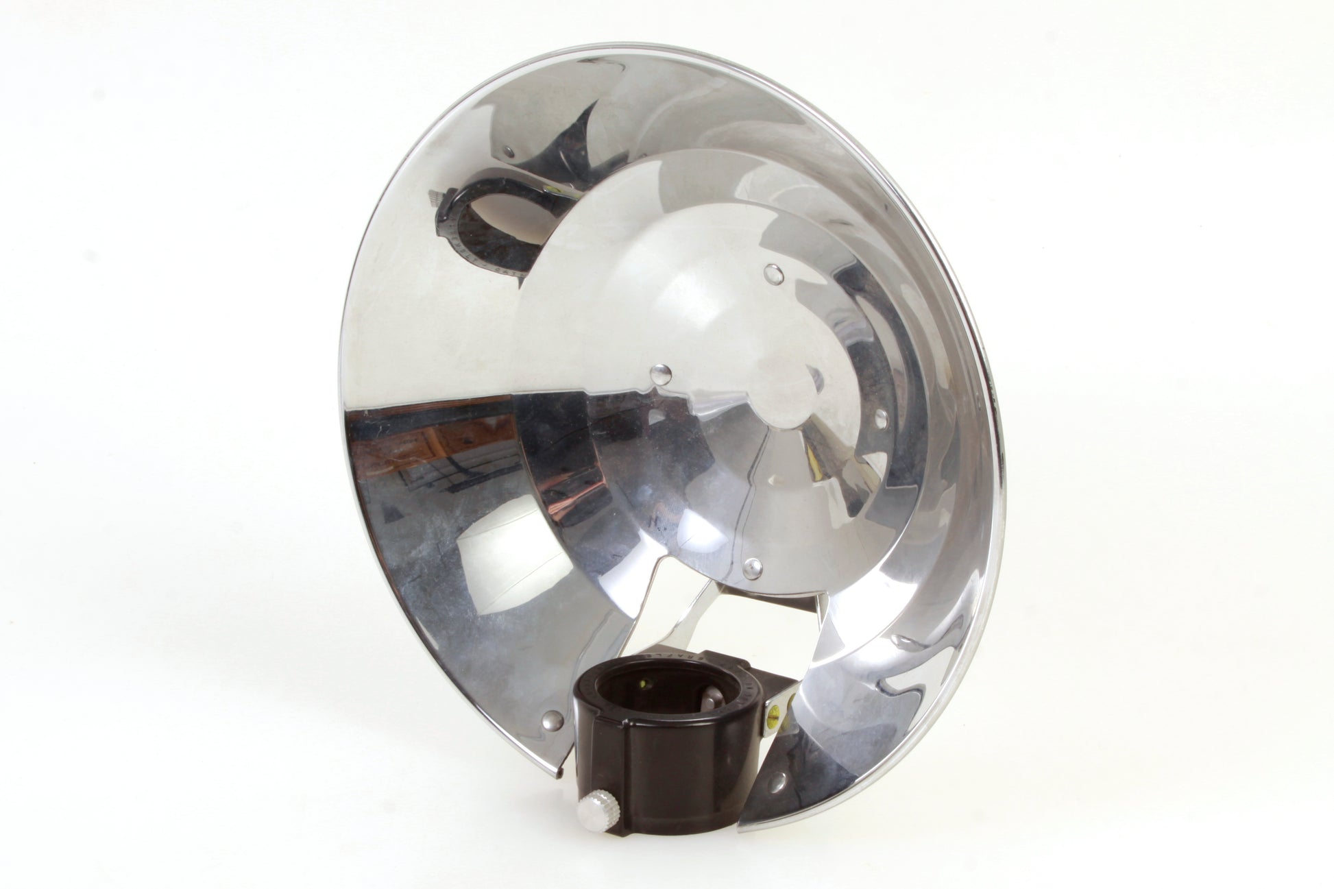 Graflex #2747 Reflector. Measures approximately 7.25 inches diameter and 3.75 inches overall depth. Cosmetically it is in good vintage condition with some scratches, some areas of wear and some corrosion to some of the screws.