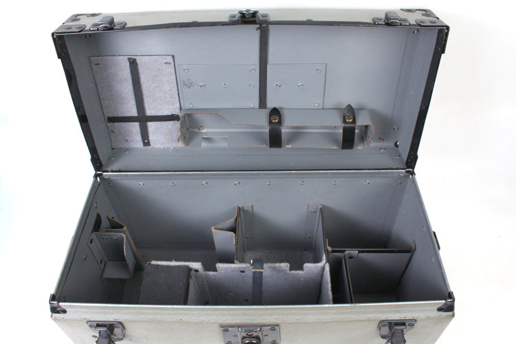 GRAFLEX VULCANOID HANDICASE FOR 45 SUPER SPEED SUPER GRAPHIC (CATALOG NO. 4266). MEASURES APPROXIMATELY 19 1/2 X 9 1/4 X 11 3/4 INCHES. THERE IS A LOCK IN THE MIDDLE CLASP BUT THERE IS NO KEY. THE CLASP STILL WORKS. THE TWO CLASPS AT THE LEFT AND RIGHT OF THE FRONT WORK. THE INTERIOR HAS VARIOUS COMPARTMENTS - PLEASE SEE PHOTOS. THERE ARE SOME MARKS AND SCRATCHES TO THE CASE BUT OVERALL IT IS IN GOOD VINTAGE CONDITION. THE INTERIOR WOULD BENEFIT FROM CLEANING.