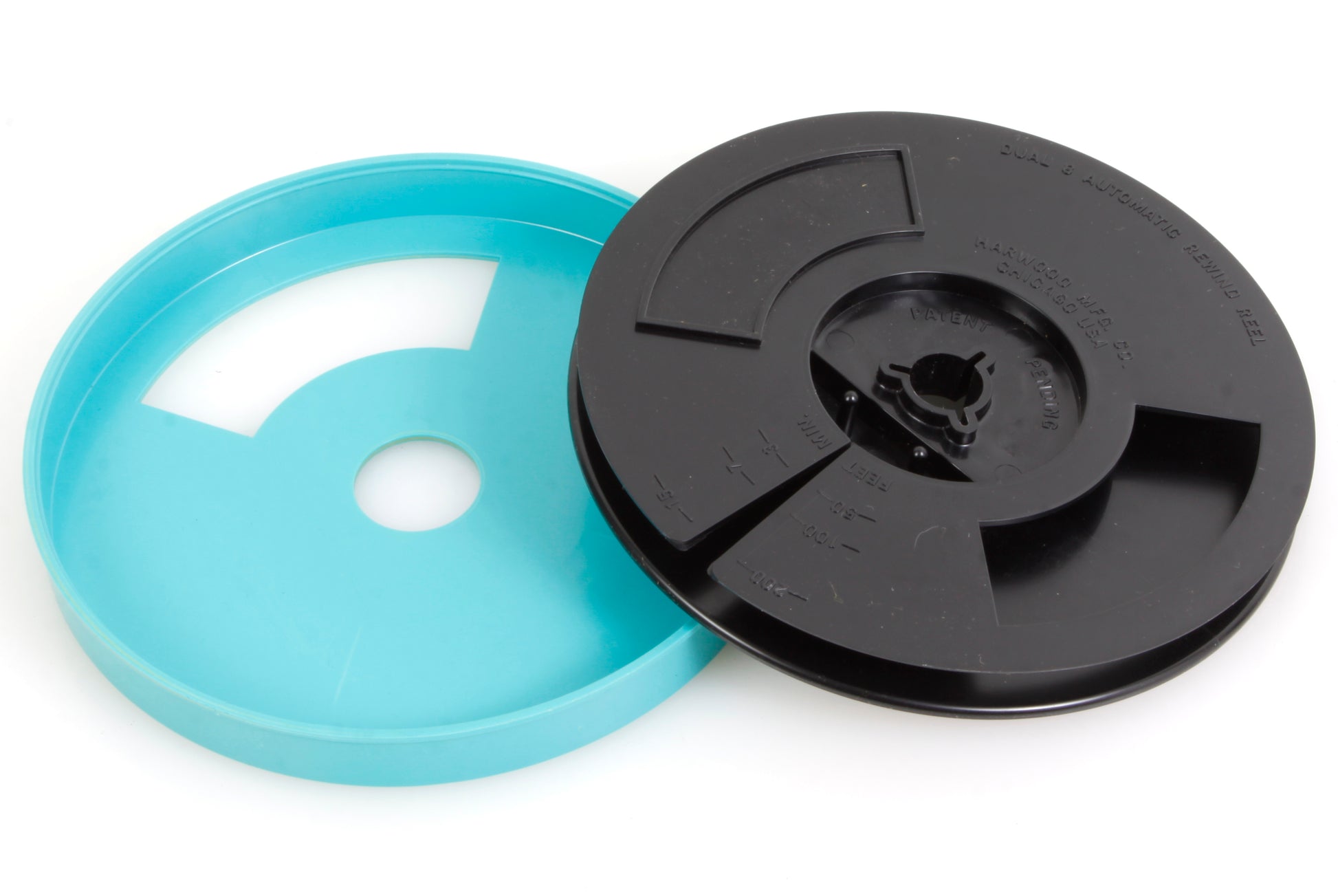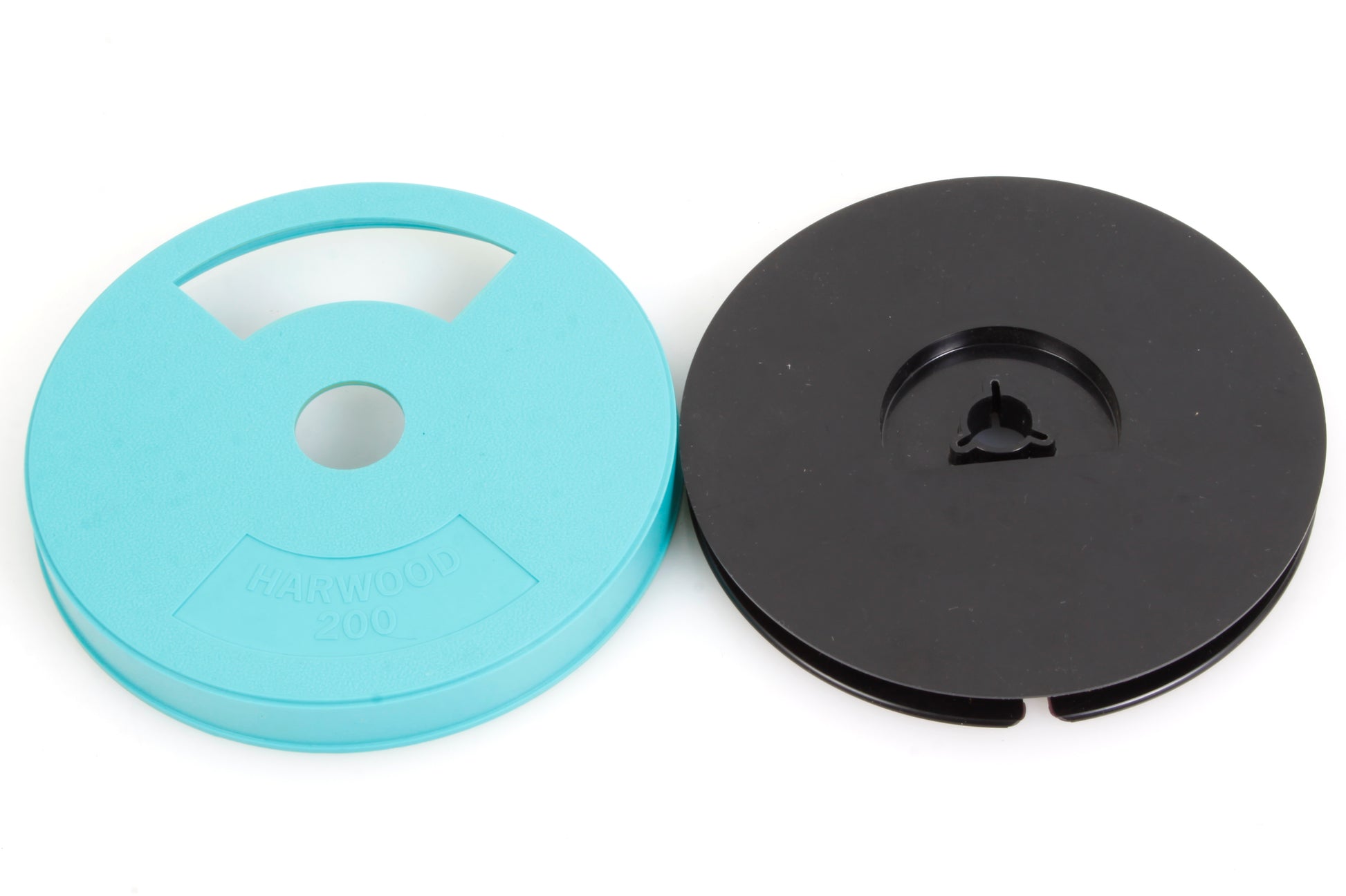 Harwood Dual 8 plastic reel and case to hold 200ft of film. Reel measures approximately 5 inches diameter and 1/2 inch deep. Case measures approximately 5 1/4 inches diameter and 5/8 inch deep. In very good vintage condition with some light scratches.