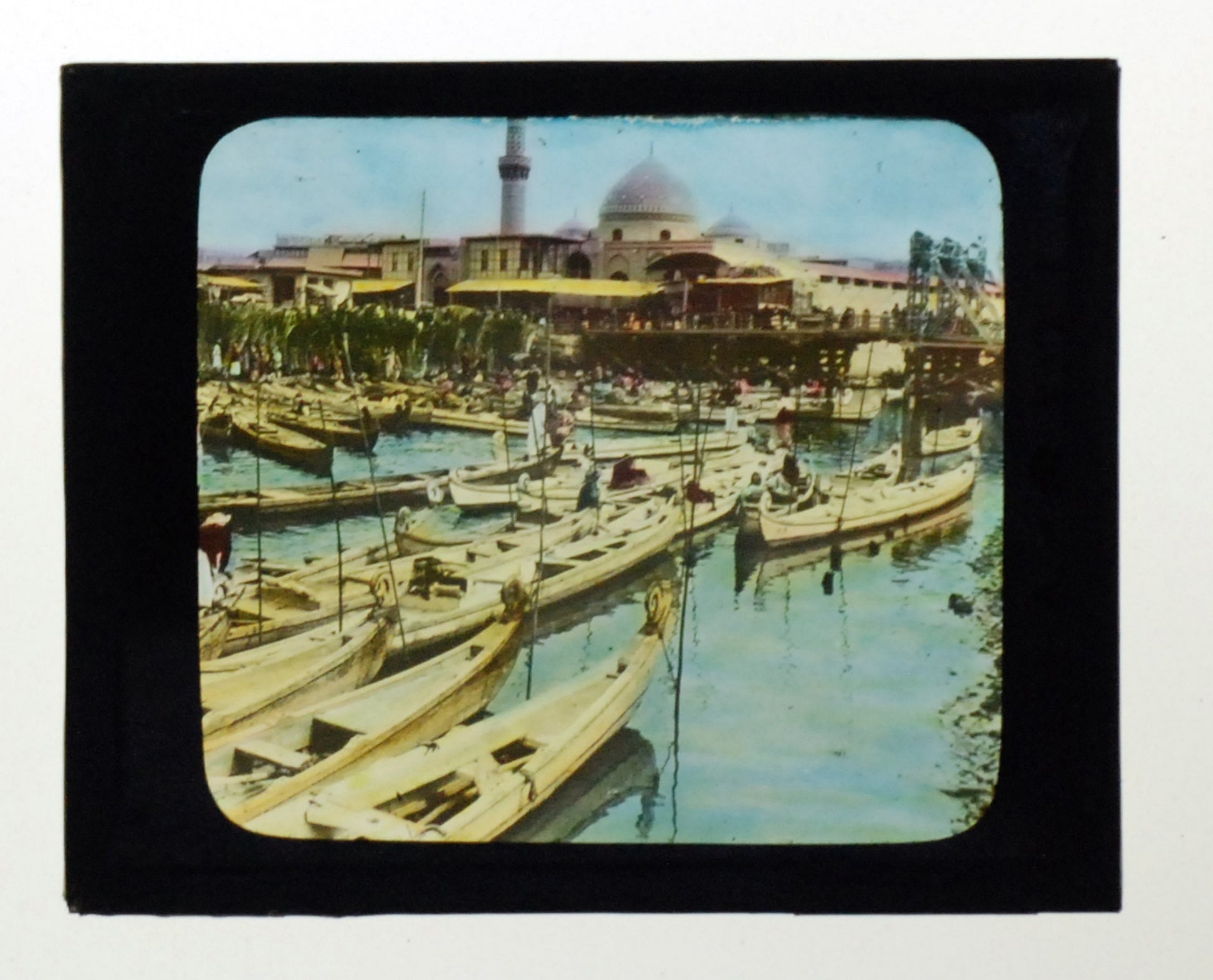 Iraq Canal Crowded with Boats Hand Tinted Antique Photo On Glass. IN VINTAGE CONDITION WITH NORMAL WEAR FROM AGE.