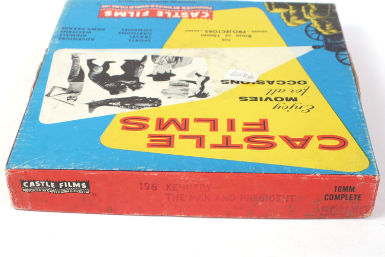 CASTLE FILMS 196 KENNEDY - THE MAN AND PRESIDENT 16MM. IN ORIGINAL BOX. FILM APPEARS TO BE IN GOOD VINTAGE CONDITION. NOT TESTED IN FILM PROJECTOR. SOME DAMAGE TO THE BOX.