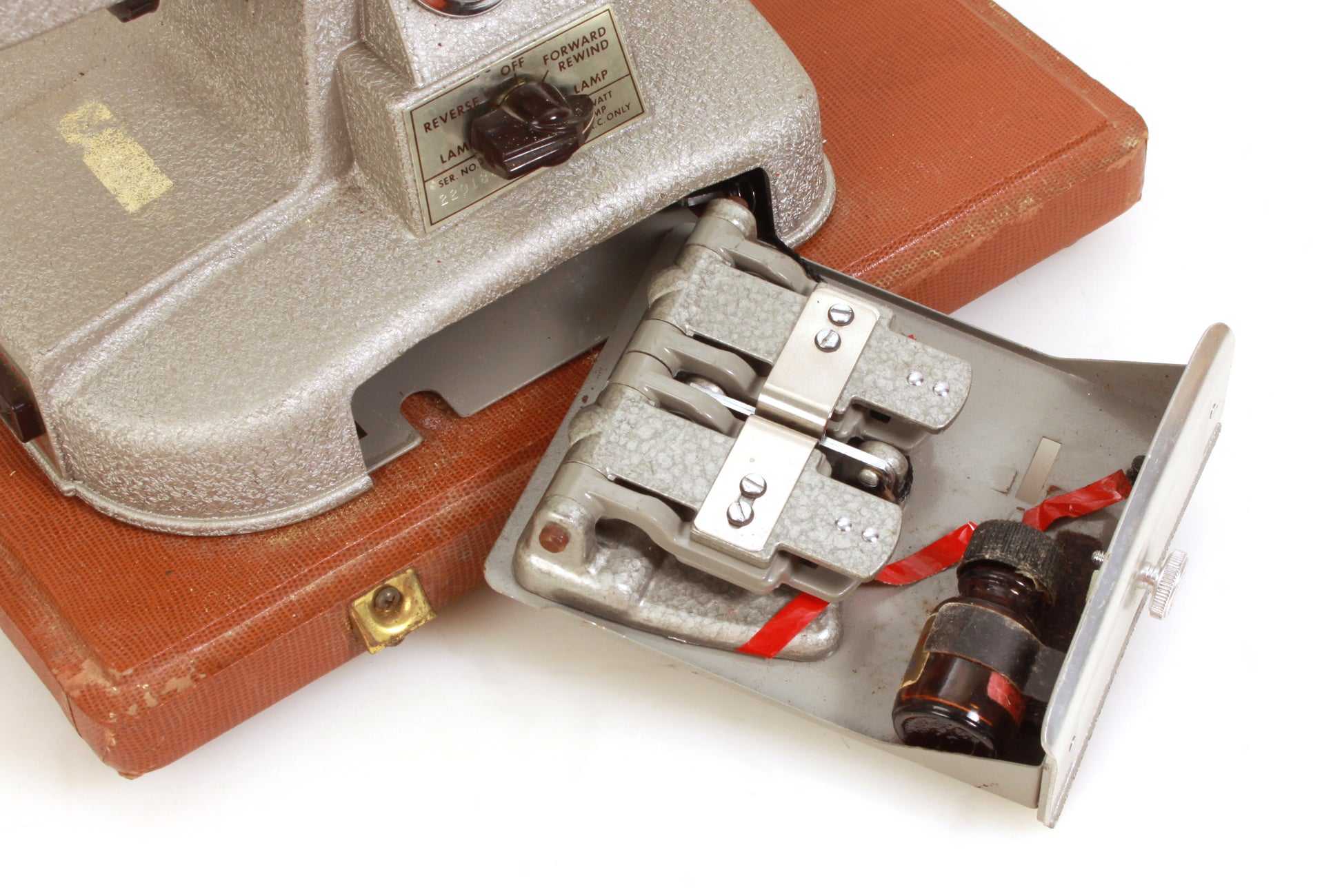 KEYSTONE 109D 8MM FILM PROJECTOR WITH F/1.6 LENS. ITEM IS UNTESTED AND SOLD AS IS - FOR PROP OR DISPLAY. DOES NOT COME WITH POWER CORD. COSMETICALLY IT IS IN GOOD VINTAGE CONDITION. SOME GENERAL SIGNS OF AGE AND USE. THERE IS SOME DUST AND HAZE PRESENT TO THE LENS. INCLUDES A SPLICER AND BOTTLE OF CEMENT WHICH FIT IN A DRAWER IN THE BASE. COMES WITH ITS ORIGINAL CASE. OVERALL MEASUREMENTS APPROXIMATELY 17 5/8 X 12 X 9 1/4 INCHES. SOME WEAR TO THE CASE.
