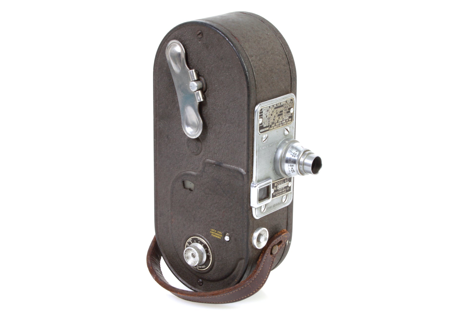 Keystone Model A-7 16mm camera with Wollensak f/2.5 cine velostigmat 1 inch focus lens. The motor is not running - we do not know what the issue is so it is sold as is - for prop or display only. Cosmetically it has some general signs of age and use. There looks to be dust and haze present to the lens but no visible scratches. Aperture movement is fine. Significant haze to the viewfinder. The leather strap is still intact. Sold as is.