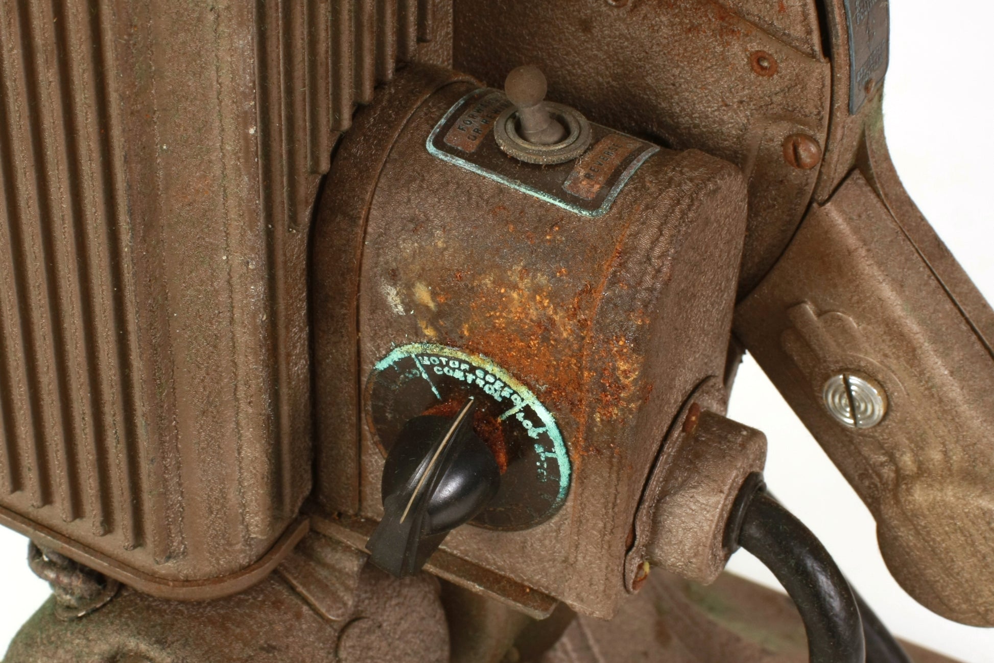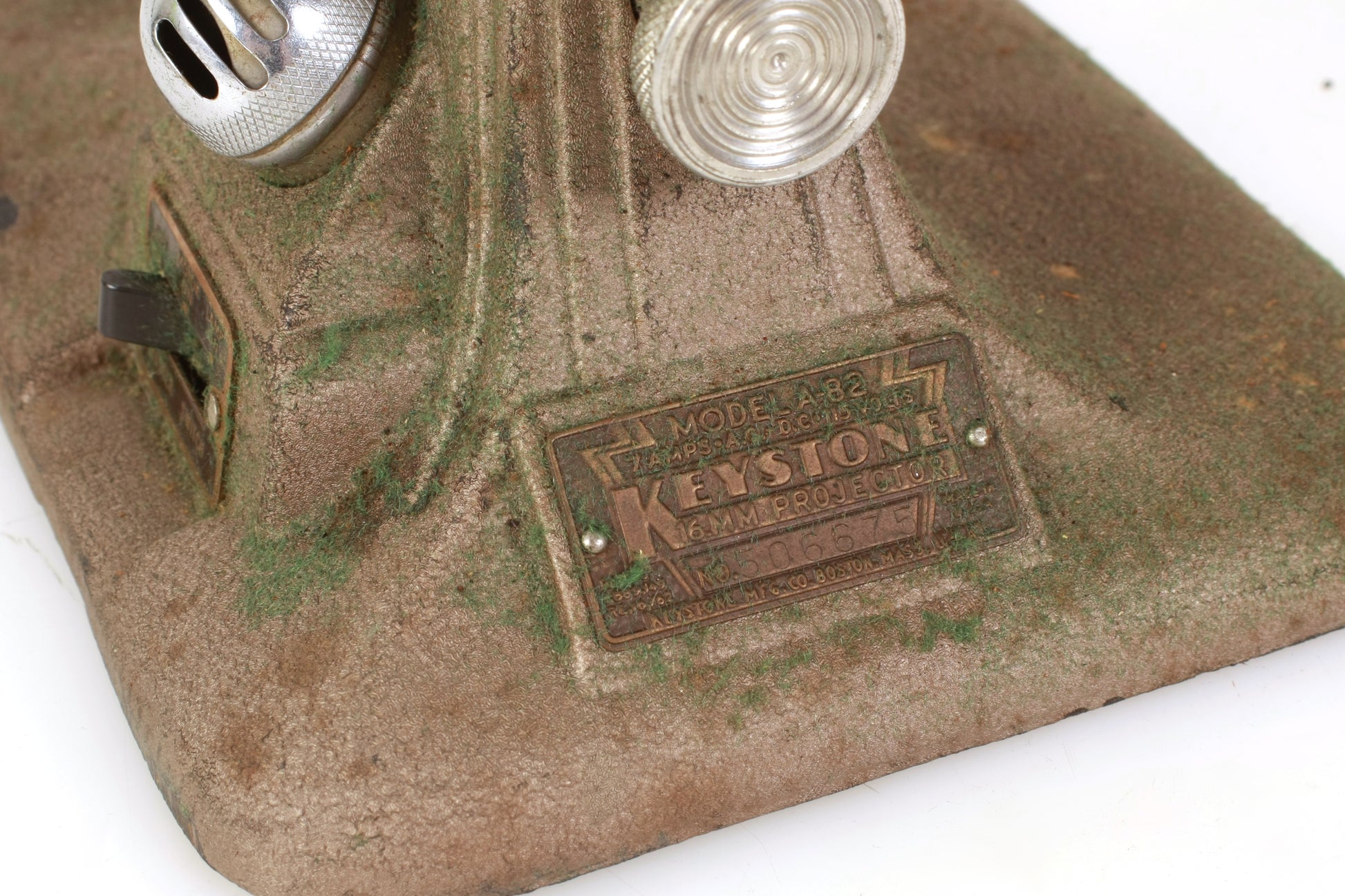 KEYSTONE MODEL A-82 16MM PROJECTOR. IT HAS BEEN PLUGGED IN AND IT POWERS ON AND THE MOTOR WORKS BUT IT HAS NOT BEEN FULLY TESTED SO IT IS SOLD AS IS - FOR PROP OR DISPLAY. COSMETICALLY IT HAS SOME WEAR AND TEAR, SOME RUST AND CORROSION IN PLACES. COMES WITH METAL REEL WHICH MEASURES 7 INCHES DIAMETER. THERE IS SOME RUST TO THE REEL. IT COMES WITH A CASE. THE CASE HAS SOME WEAR AND TEAR AND IT IS MISSING THE HANDLE. THE CASE MEASURES APPROXIMATELY 15 3/4 INCHES LONG X 10 1/4 INCHES WIDE X 9 1/4 INCHES DEEP. DOES NOT COME WITH LENS.