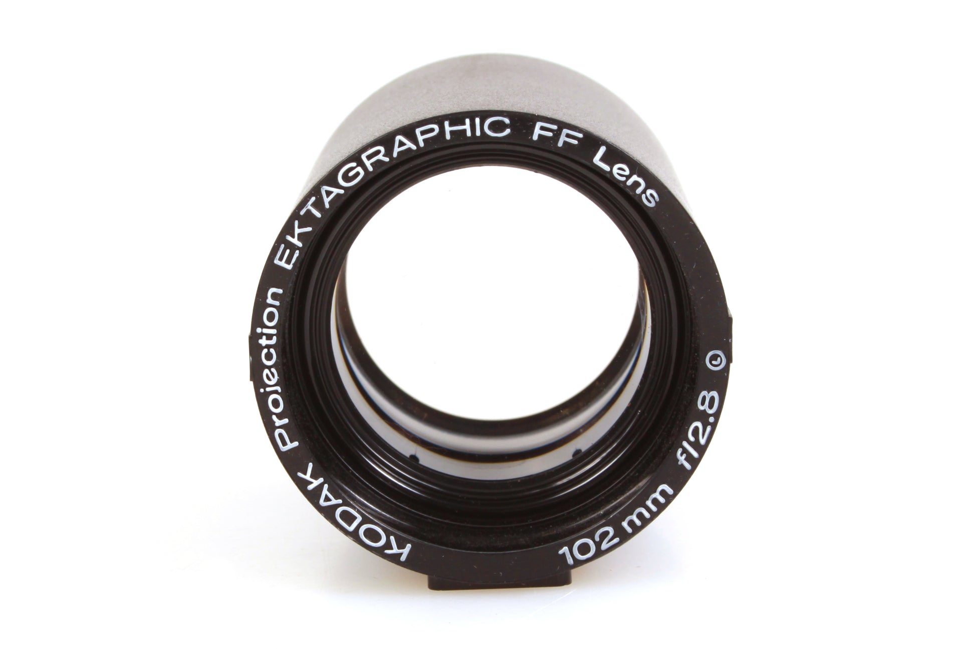 Kodak Projection Ektagraphic FF lens 102mm f/2.8. There is some dust and haze present to the lens but no scratches. The barrel is in very good cosmetic condition.