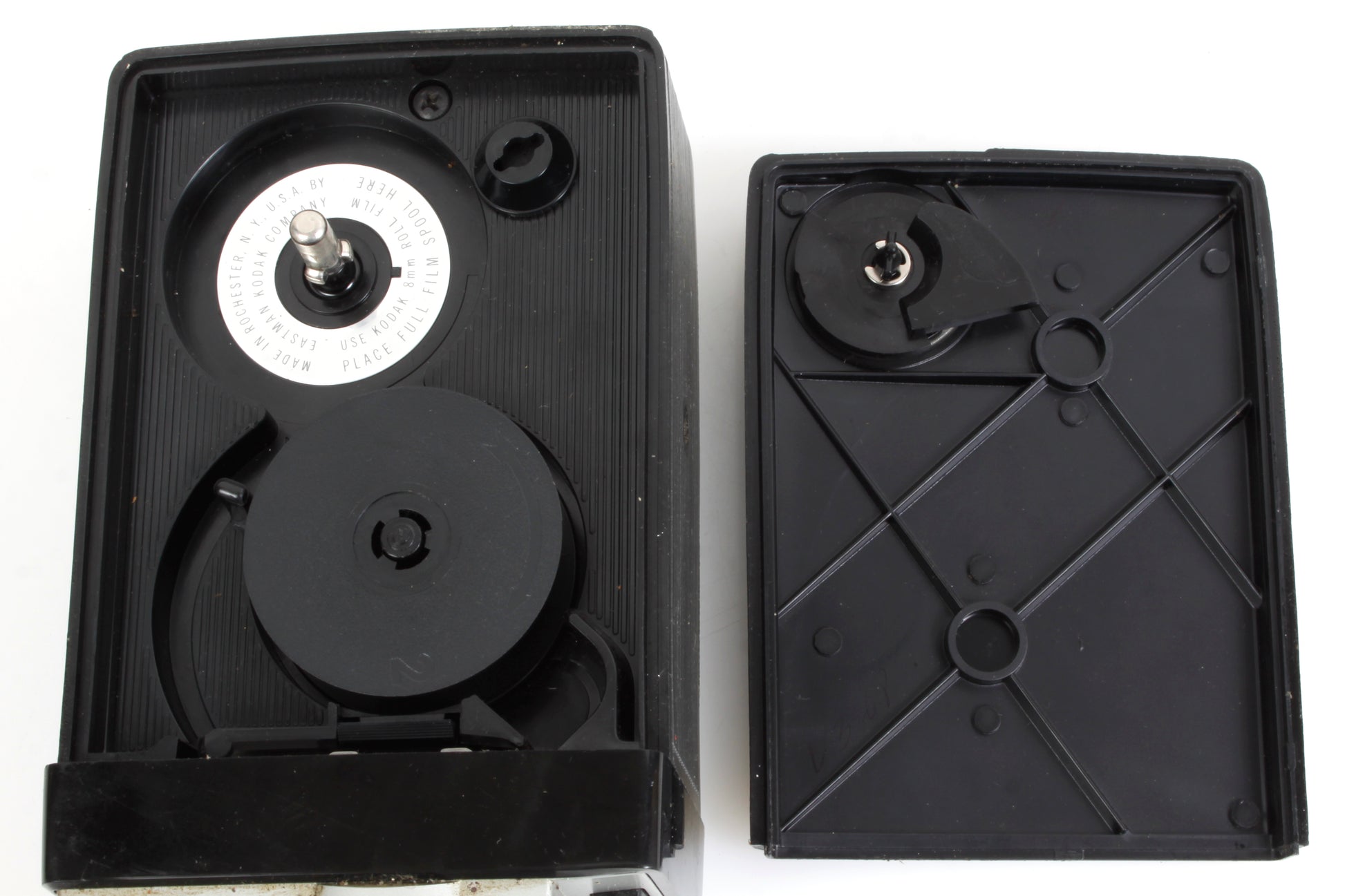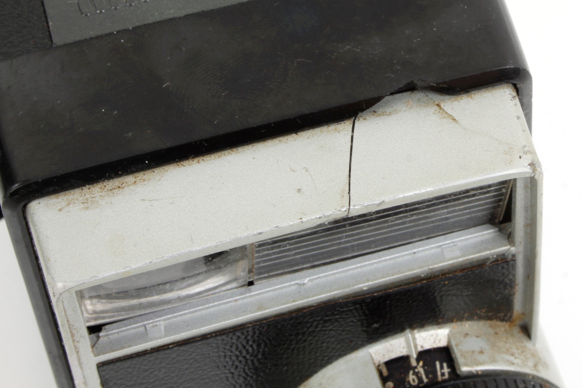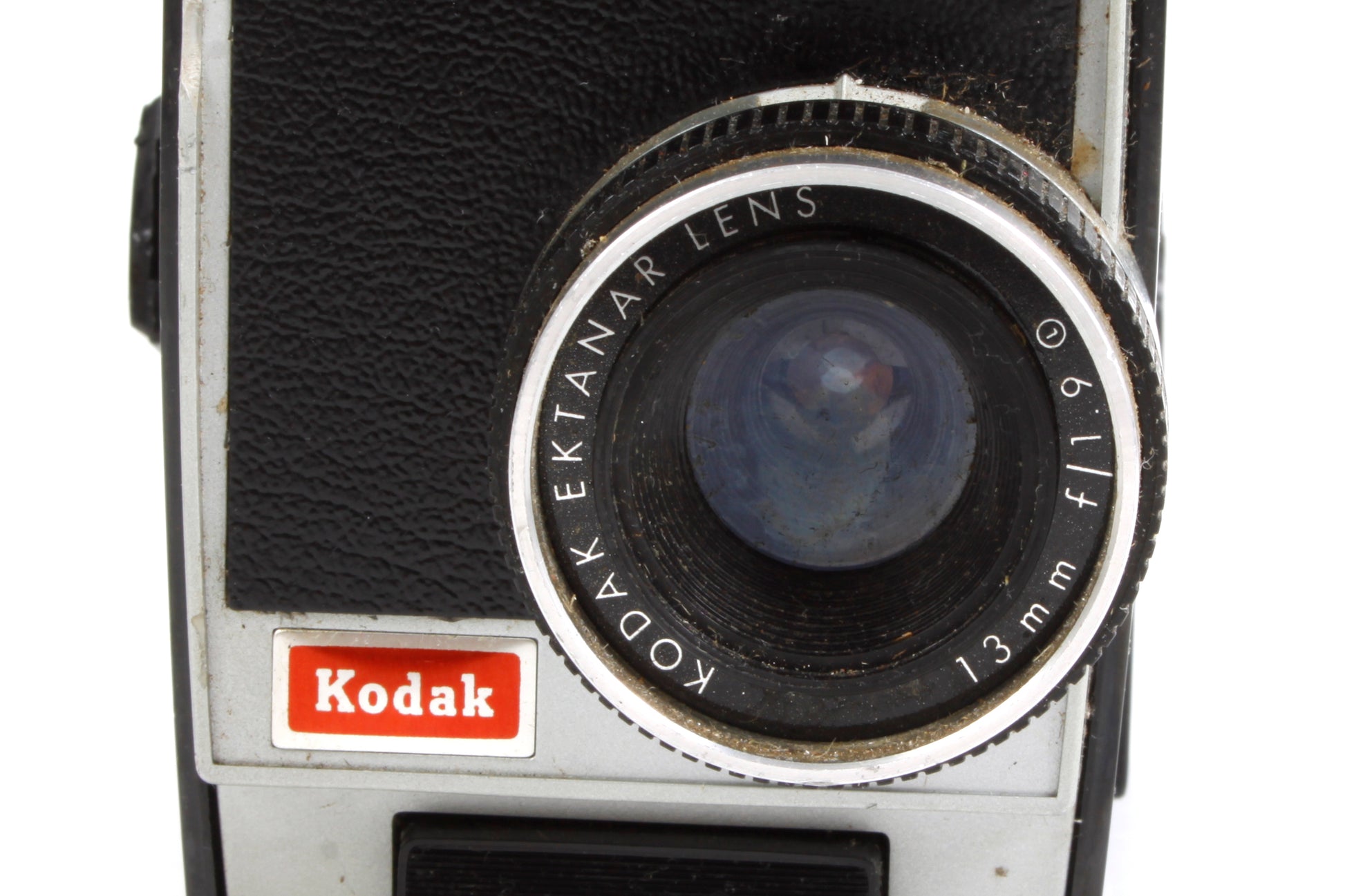 Kodak 8 movie camera f/1.9. The motor does not seem to be working despite winding it. Cosmetically it has some general signs of age and use, some chips and cracks. Some haze present to the viewfinder. Sold as is.