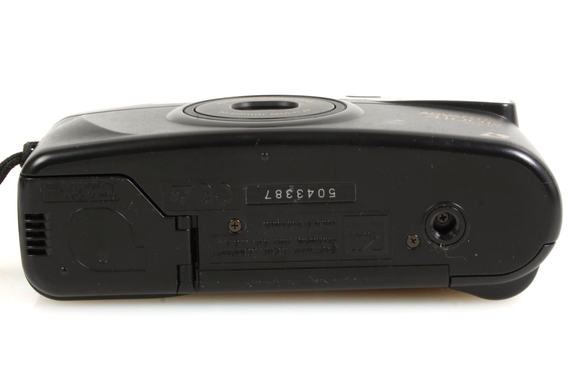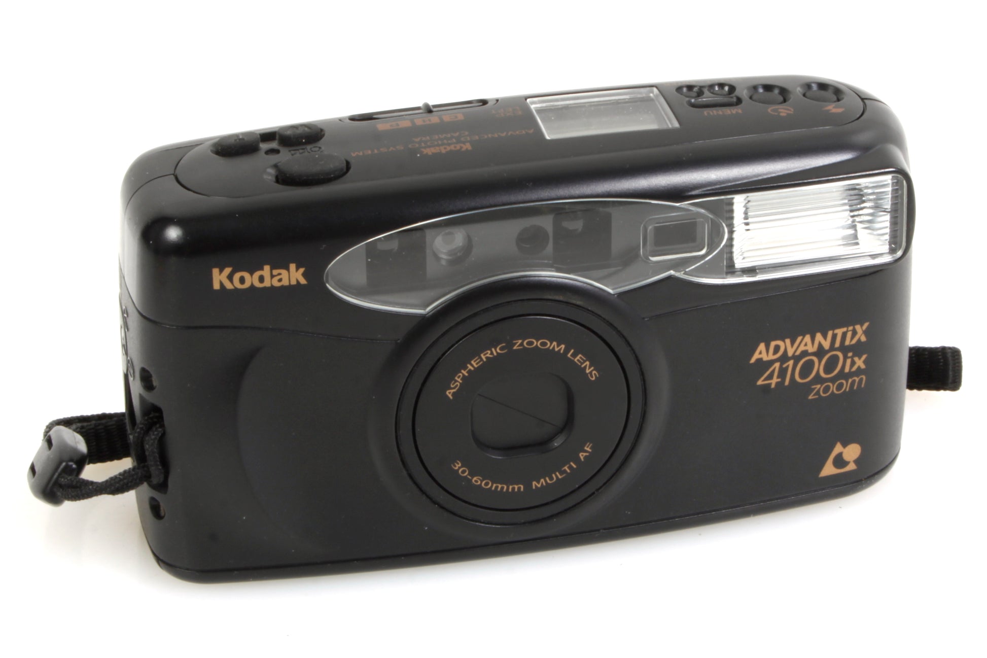 Kodak Advantix 4100ix Zoom camera. In working order, although it has not been tested with film or for accuracy. Cosmetically the camera is in very good vintage condition with only light signs of use. The viewfinder is clear of haze and cracks. The battery compartment is clean and free of corrosion. Comes with one roll of APS film still in its original packaging. The develop before date was 2000 so we cannot guarantee its condition or usability.