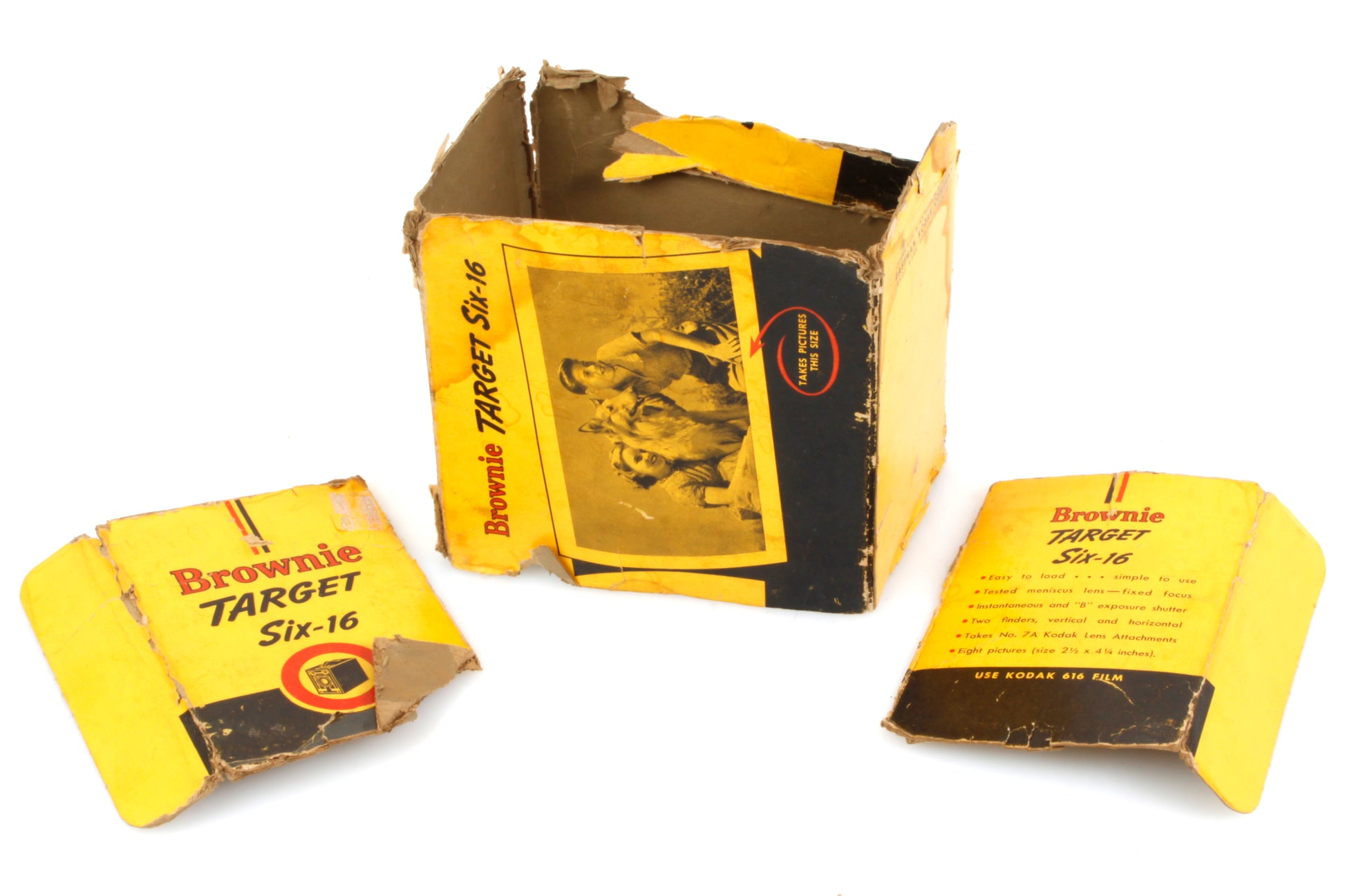 Kodak Brownie Target Six-16 camera. The shutter seems to be firing fine, although it has not been tested with film or for accuracy. New old stock. There are some signs of age but it looks like it hasnt been used. Some rust present to some of the metal parts. Comes with its original price tag and its original box. Significant damage to the box.