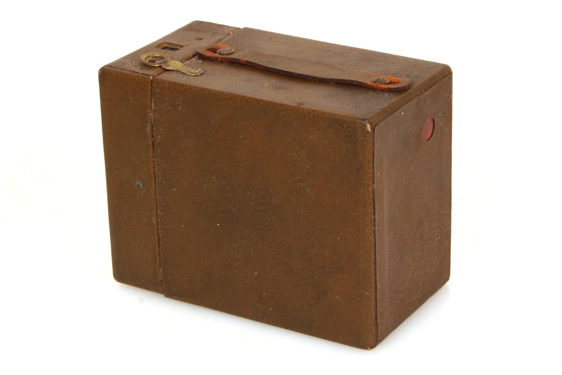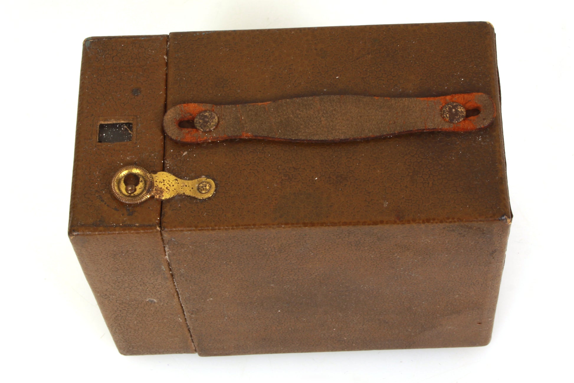 50th anniversary EKC box camera. Brown exterior. The shutter looks to be firing fine, although it has not been tested with film or for accuracy. Cosmetically it has some general wear and tear, the top strap has some wear and the viewfinder has significant dust and haze. Sold as is.
