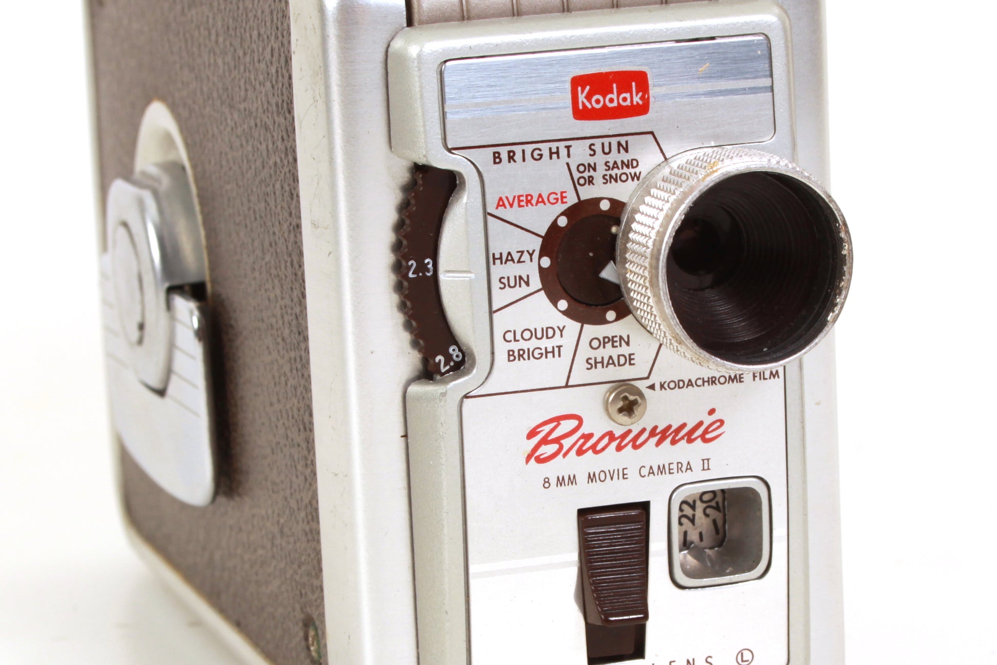 KODAK BROWNIE 8MM MOVIE CAMERA II WITH 13MM F/2.3 LENS. LOOKS TO BE IN WORKING ORDER - THE MOTOR IS WORKING, ALTHOUGH IT HAS NOT BEEN TESTED WITH FILM OR FOR ACCURACY. COSMETICALLY THE CAMERA IS IN GOOD VINTAGE CONDITION WITH SOME SCRATCHES AND AREAS OF WEAR. THE FRONT FINDER PIECE HAS COME OFF AND IS NOT INCLUDED. THERE LOOKS TO BE SOME DUST AND HAZE TO THE LENS BUT NO VISIBLE SCRATCHES.