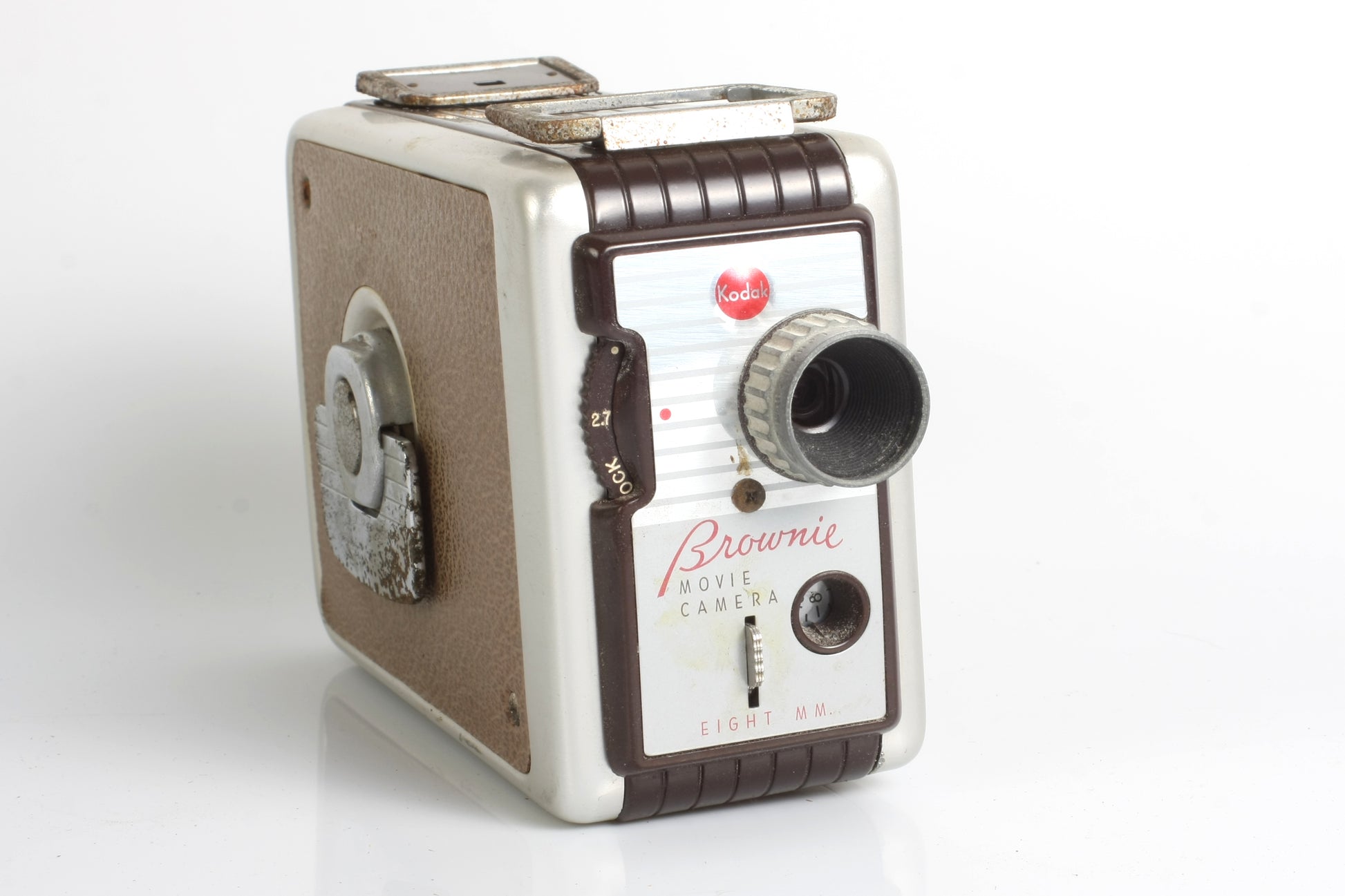 KODAK BROWNIE 8MM MOVIE CAMERA WITH EKTANON 13MM F/2.7 LENS. THE MOTOR LOOKS TO BE WORKING, ALTHOUGH IT HAS NOT BEEN TESTED WITH FILM OR FOR ACCURACY. COSMETICALLY THE CAMERA HAS SIGNS OF AGE AND USE, SOME PARTS OF THE METAL HAVE CORRODED AND RUSTED. THERE LOOKS TO BE SOME DUST AND HAZE PRESENT TO THE LENS BUT NO SCRATCHES. COMES WITH ORIGINAL BROWN LEATHER CASE PLUS NYLON STRAP. THE CASE HAS SOME DAMAGE AND PART OF IT IS MISSING. SOME OF THE METAL PARTS HAVE CORRODED AND RUSTED. SOLD AS IS.