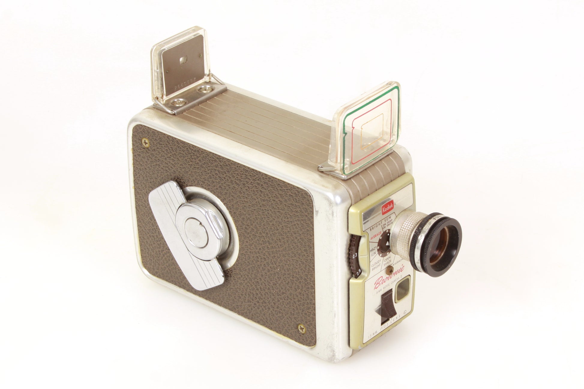 Brownie 8mm movie camera II with 13mm f/2.3 lens. Looks to be in working order - the motor is working, although it has not been tested with film or for accuracy. Cosmetically the camera is in good vintage condition with some general wear and tear. Some dust and haze present to the lens but no scratches. Some dust and haze to the viewfinder but no cracks. Comes with original manual and EB filter.