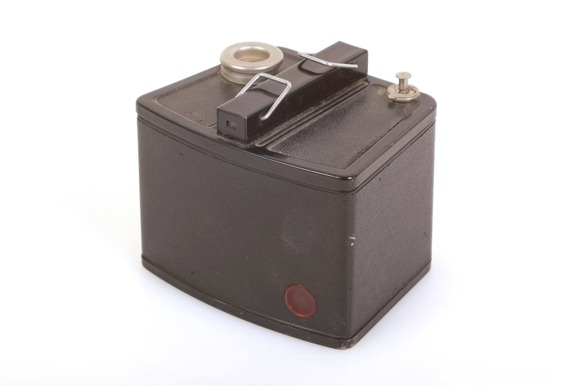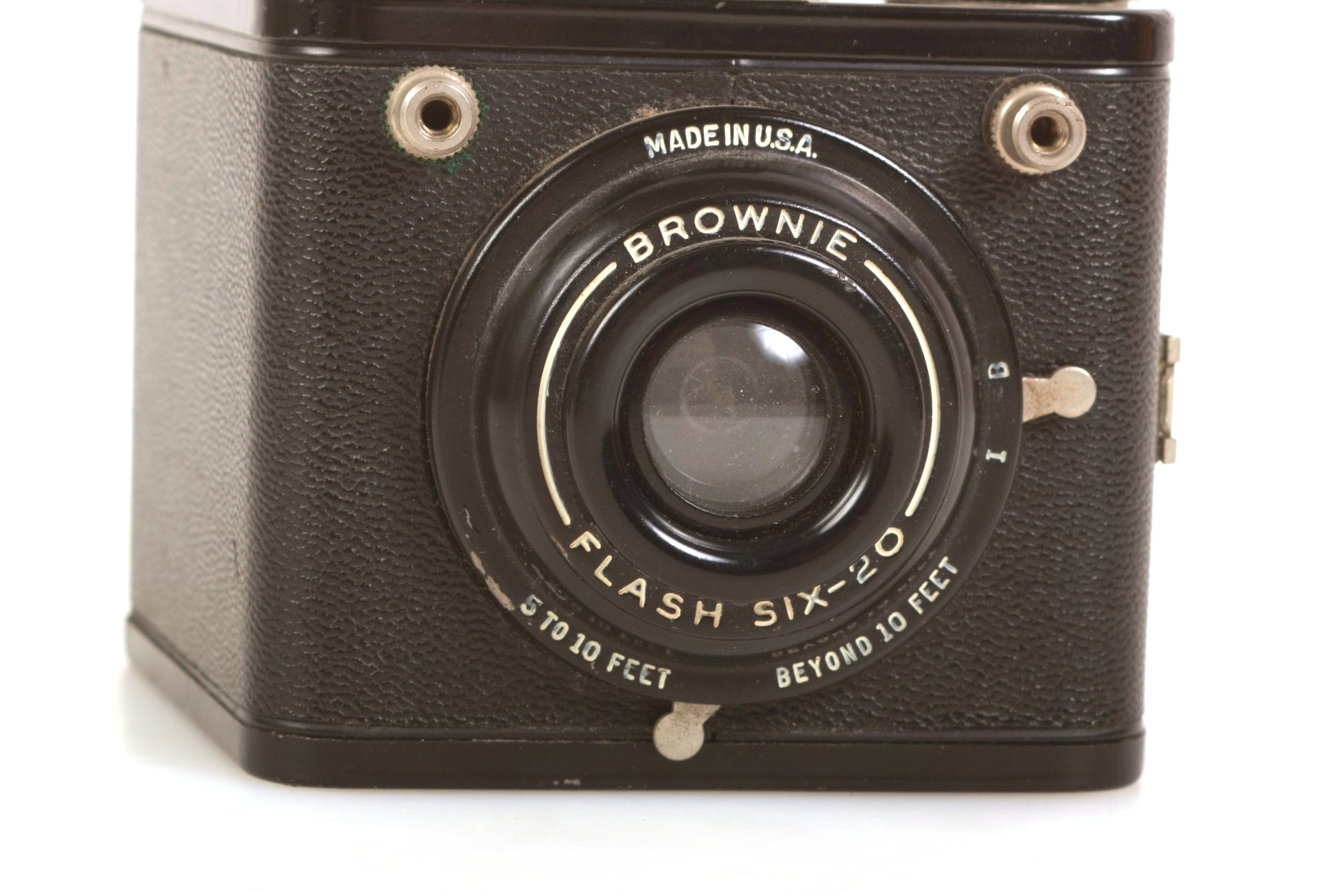 BROWNIE FLASH SIX-20 CAMERA. THE SHUTTER IS FIRING BUT IT HAS NOT BEEN TESTED WITH FILM OR FOR ACCURACY. COSMETICALLY THE CAMERA IS IN GOOD VINTAGE CONDITION WITH SOME GENERAL SIGNS OF AGE AND WEAR. THERE IS SOME DUST AND HAZE PRESENT TO THE LENS BUT NO SCRATCHES. THERE IS SOME DUST TO THE VIEWFINDER BUT NO CRACKS. DOES NOT COME WITH FLASH ATTACHMENT.