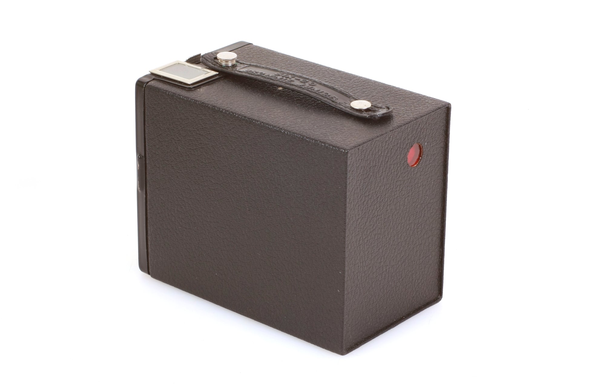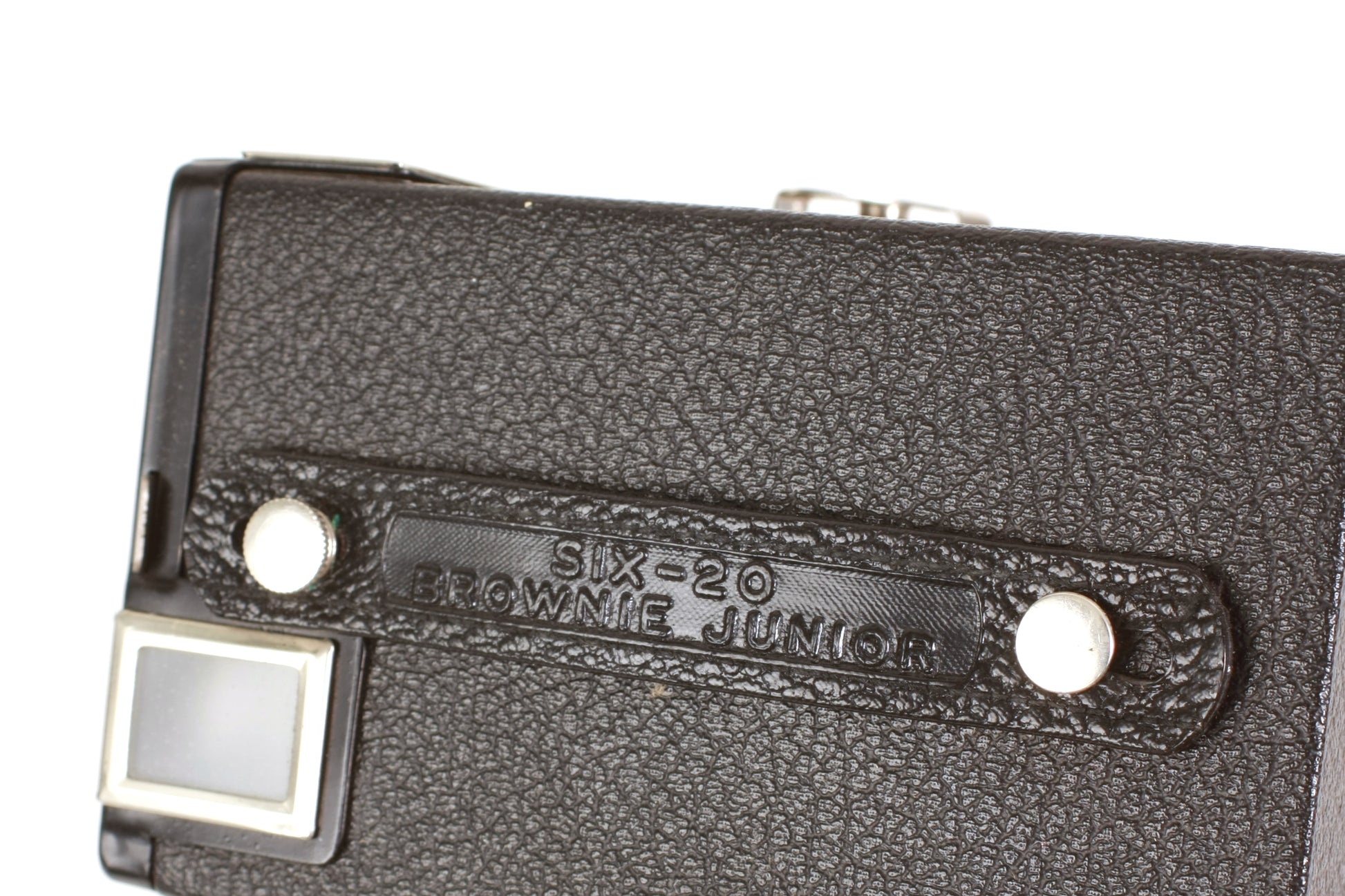 KODAK BROWNIE JUNIOR SIX-20 CAMERA. THE SHUTTER SEEMS TO FIRE FINE, ALTHOUGH IT HAS NOT BEEN TESTED WITH FILM OR FOR ACCURACY. COSMETICALLY IT IS IN VERY GOOD VINTAGE CONDITION WITH SOME LIGHT SIGNS OF AGE AND USE. THERE IS SOME DUST PRESENT TO THE LENS BUT NO HAZE OR SCRATCHES. COMES WITH ORIGINAL BOX, MANUAL, AND INDOOR EXPOSURE GUIDE. THERE IS SOME DAMAGE TO THE BOX AND IT IS MISSING ONE END. THE MANUAL AND INDOOR EXPOSURE GUIDE ARE IN GOOD VINTAGE CONDITION.