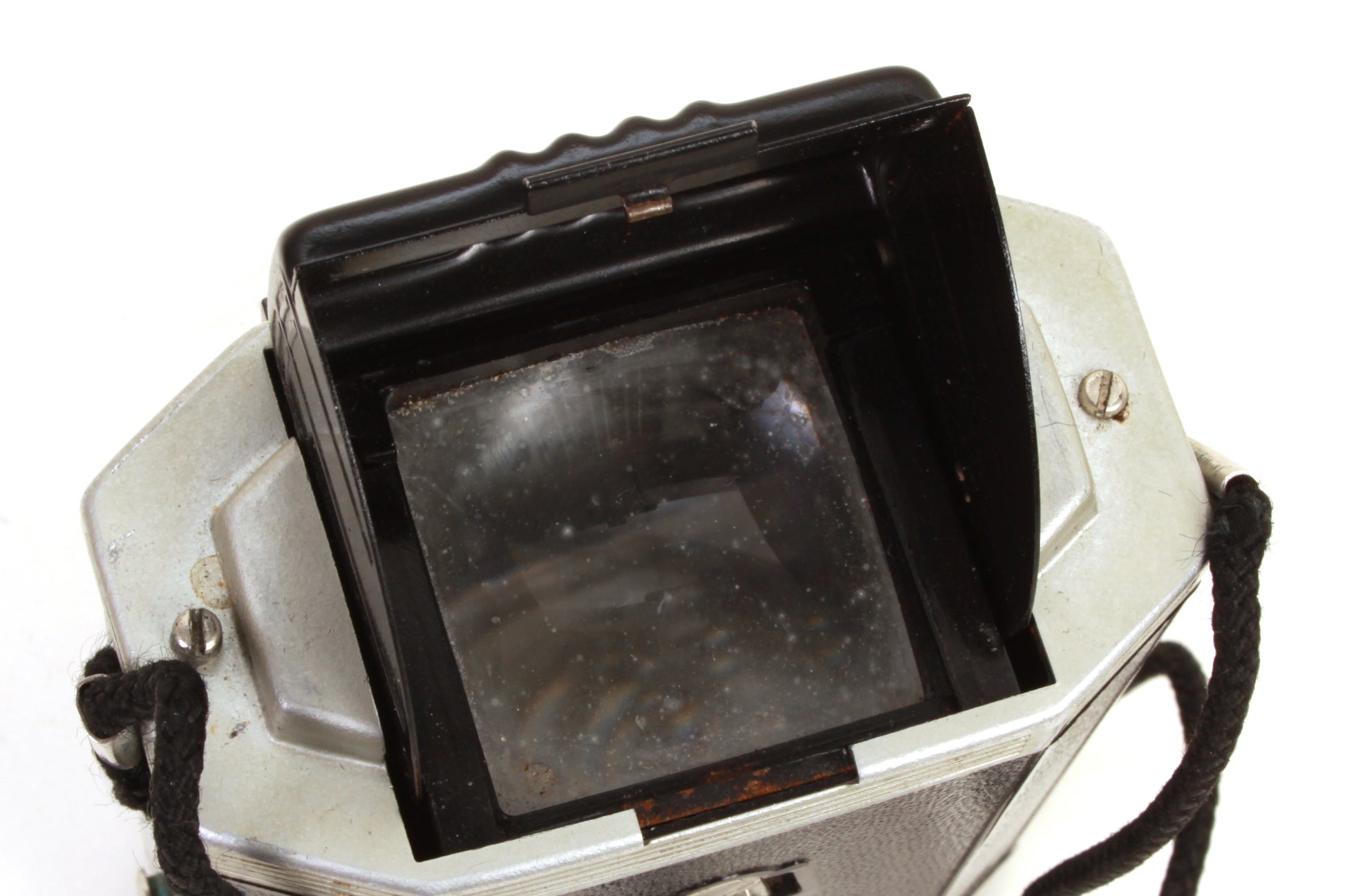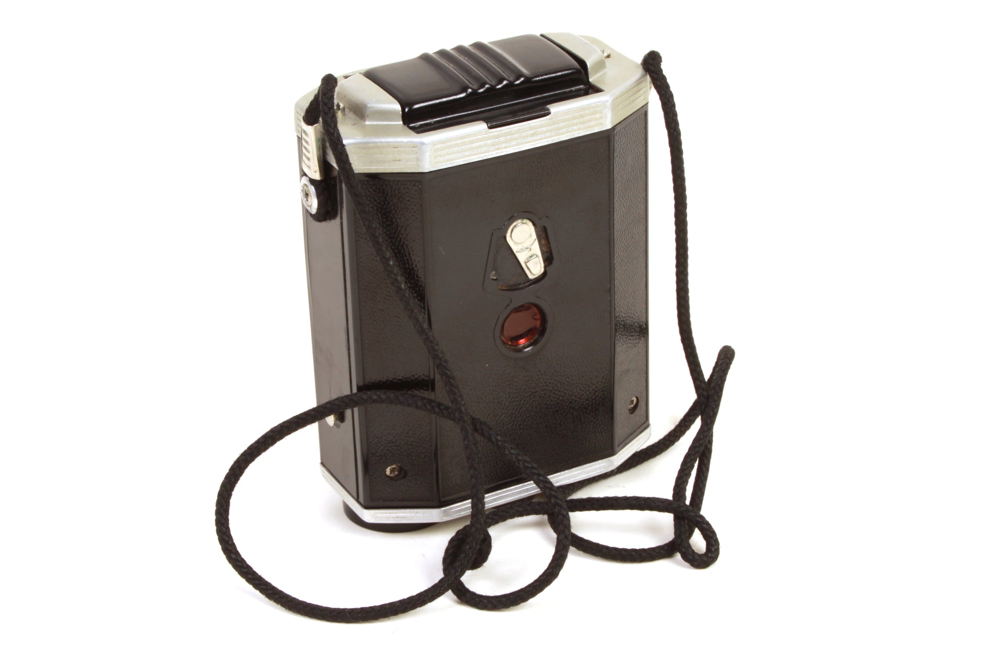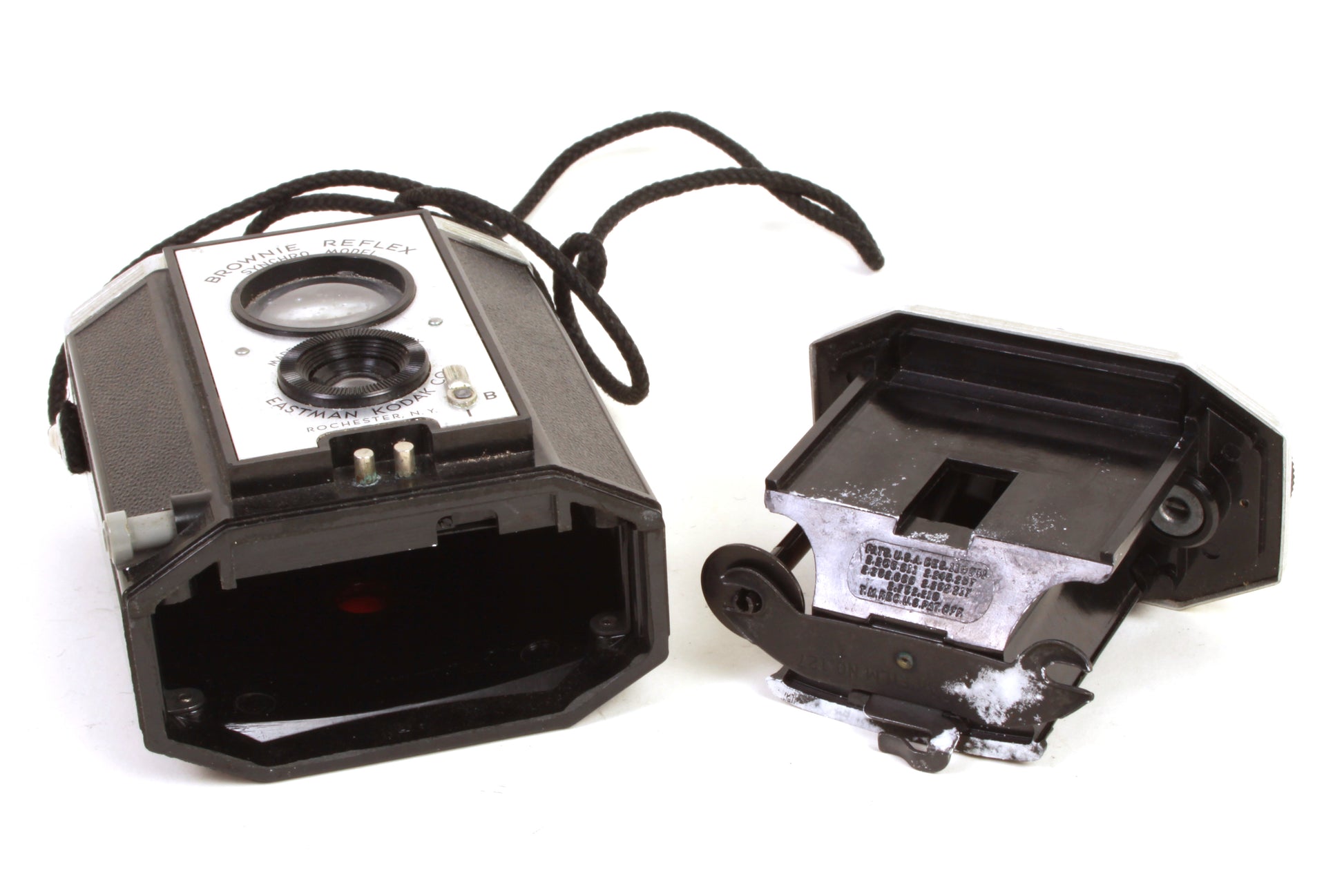 Kodak Brownie Reflex Synchro Model camera. The shutter and winding mechanism seem to be working fine, although it has not been tested with film or for accuracy. Cosmetically the body is in good vintage condition with some general signs of use but no obvious major damage. There is some fungus present to the interior of the camera. There is some dust and haze present to the lens but no scratches. There is some dust and haze present to the viewfinder but no cracks. Comes with original box. There is some damage to the box.