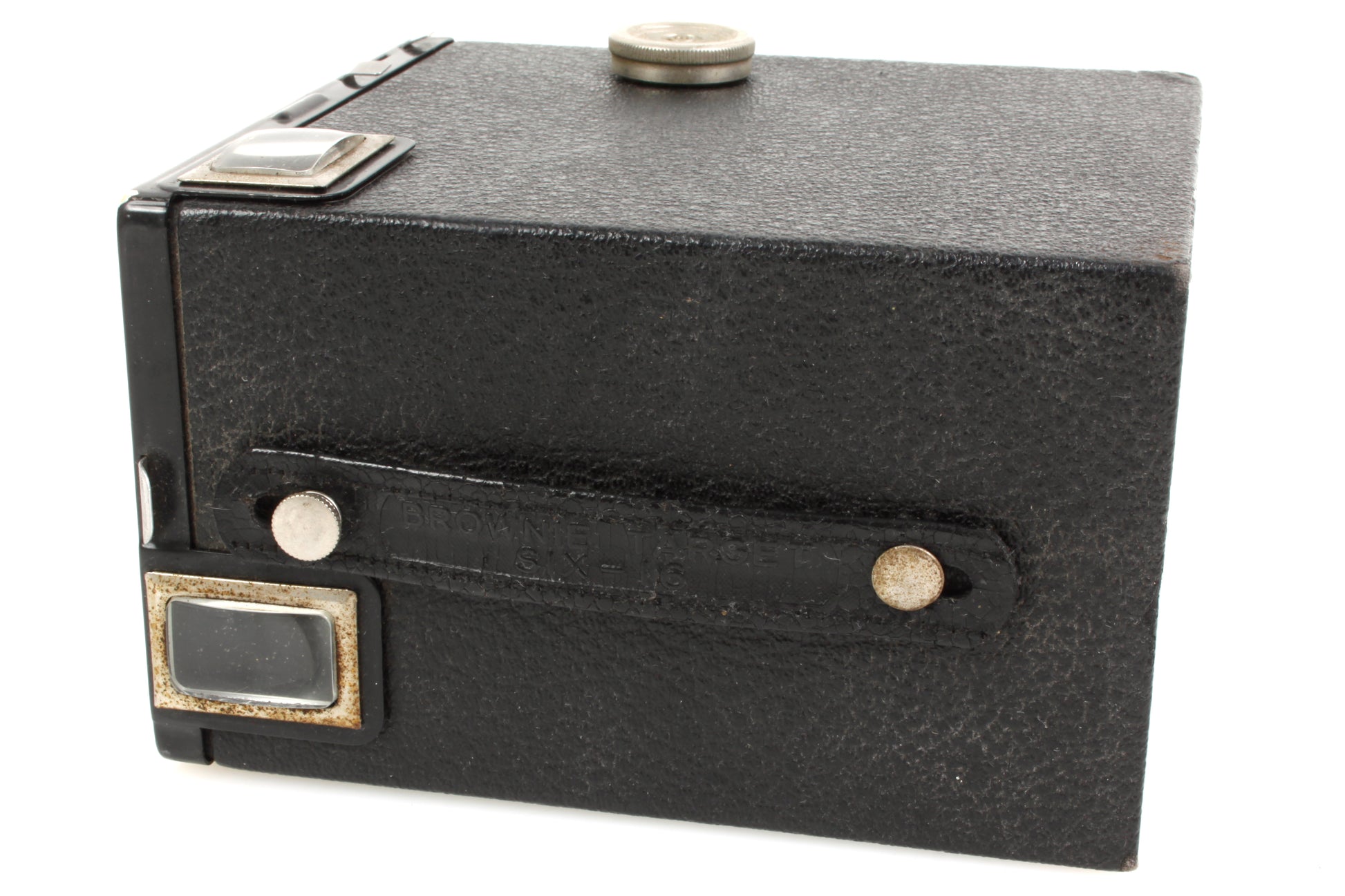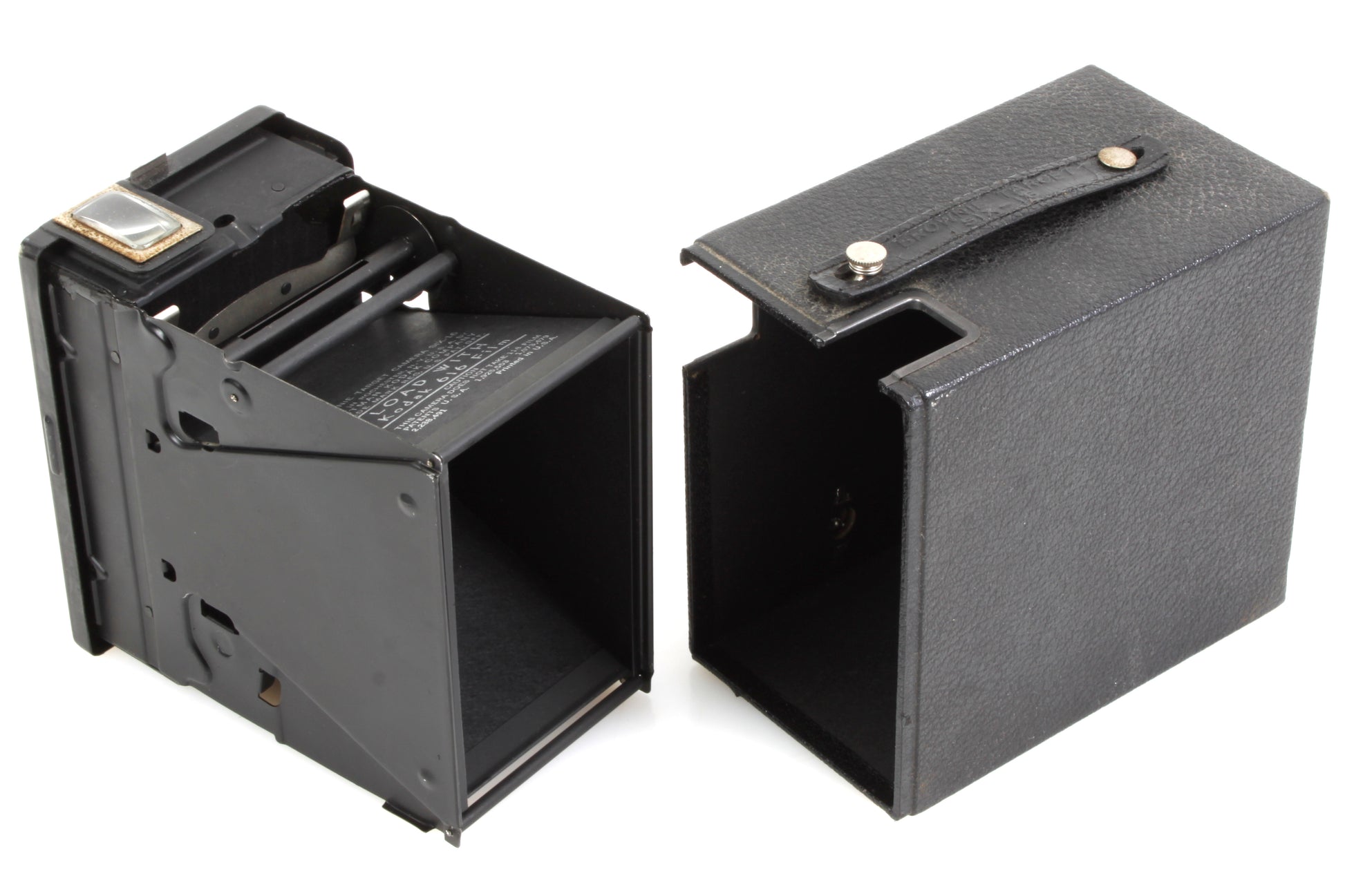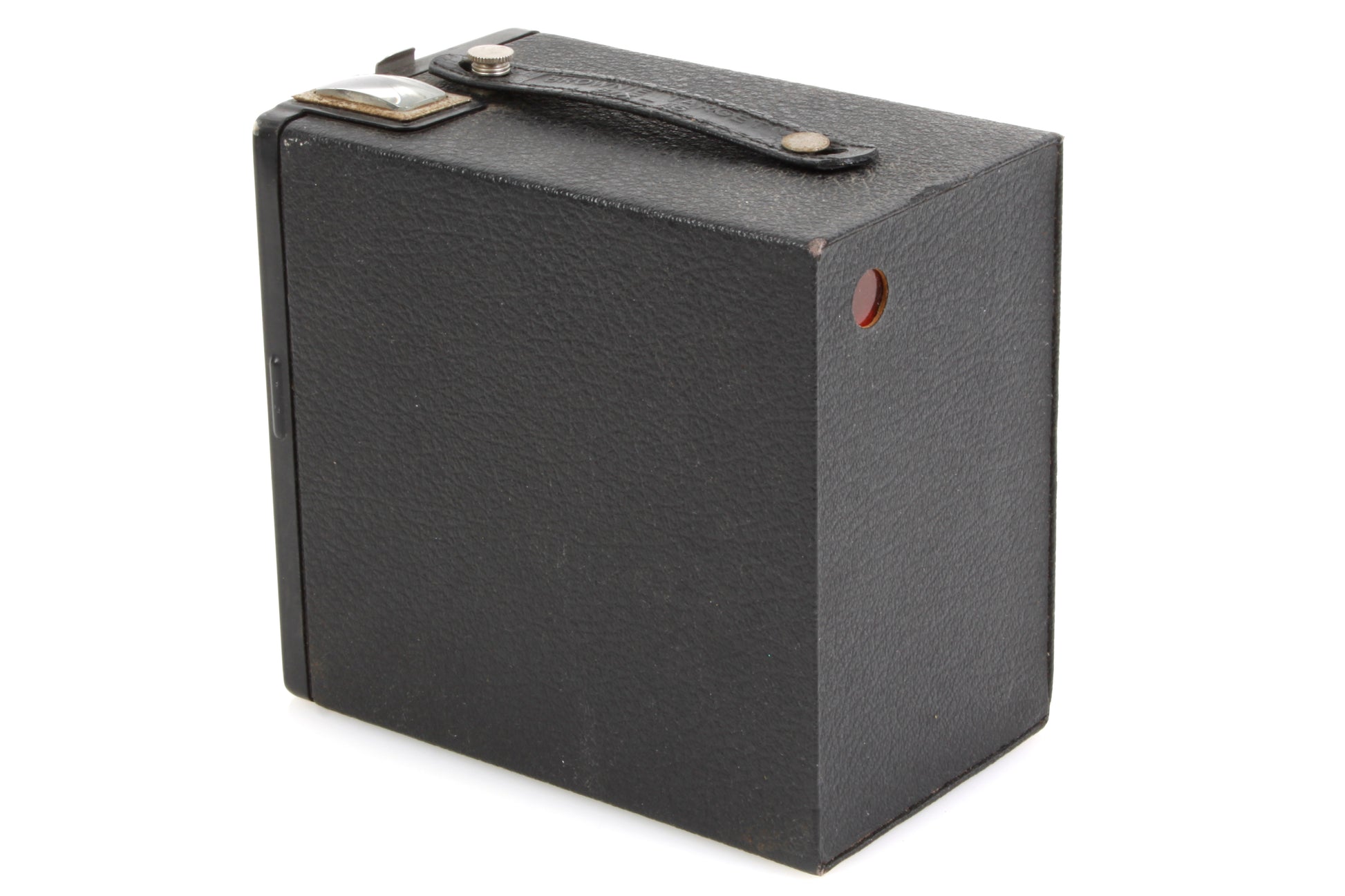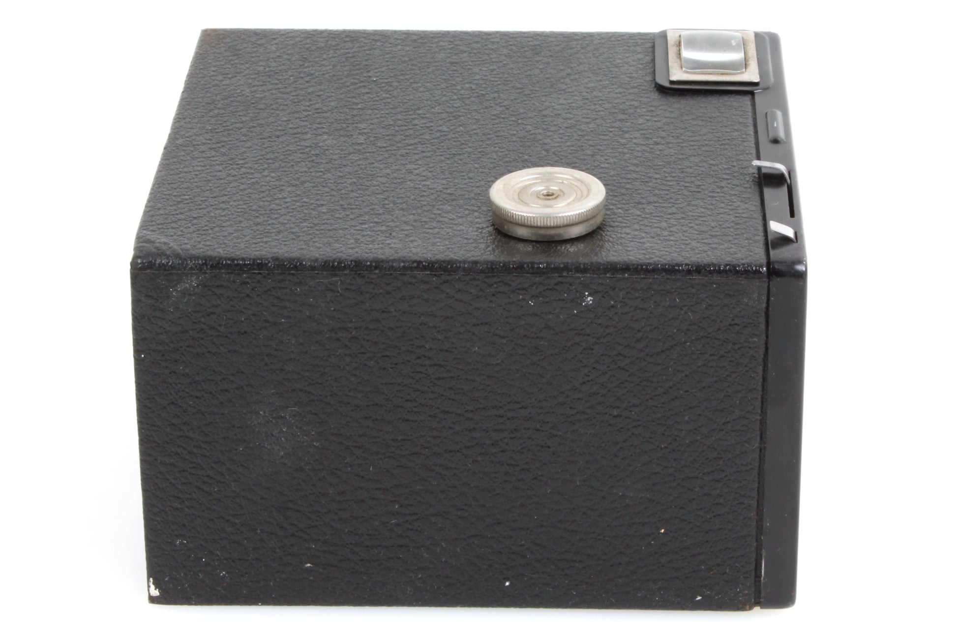 Kodak Brownie Target Six-16 camera. Looks to be in working order - the shutter is firing fine, although it has not been tested with film or for accuracy. Cosmetically it is in good vintage condition with some general signs of age and use. There looks to be some dust and haze present to the lens and viewfinder. The top strap is still intact although it does have some cracking. There are some areas of rust to some of the metal parts.