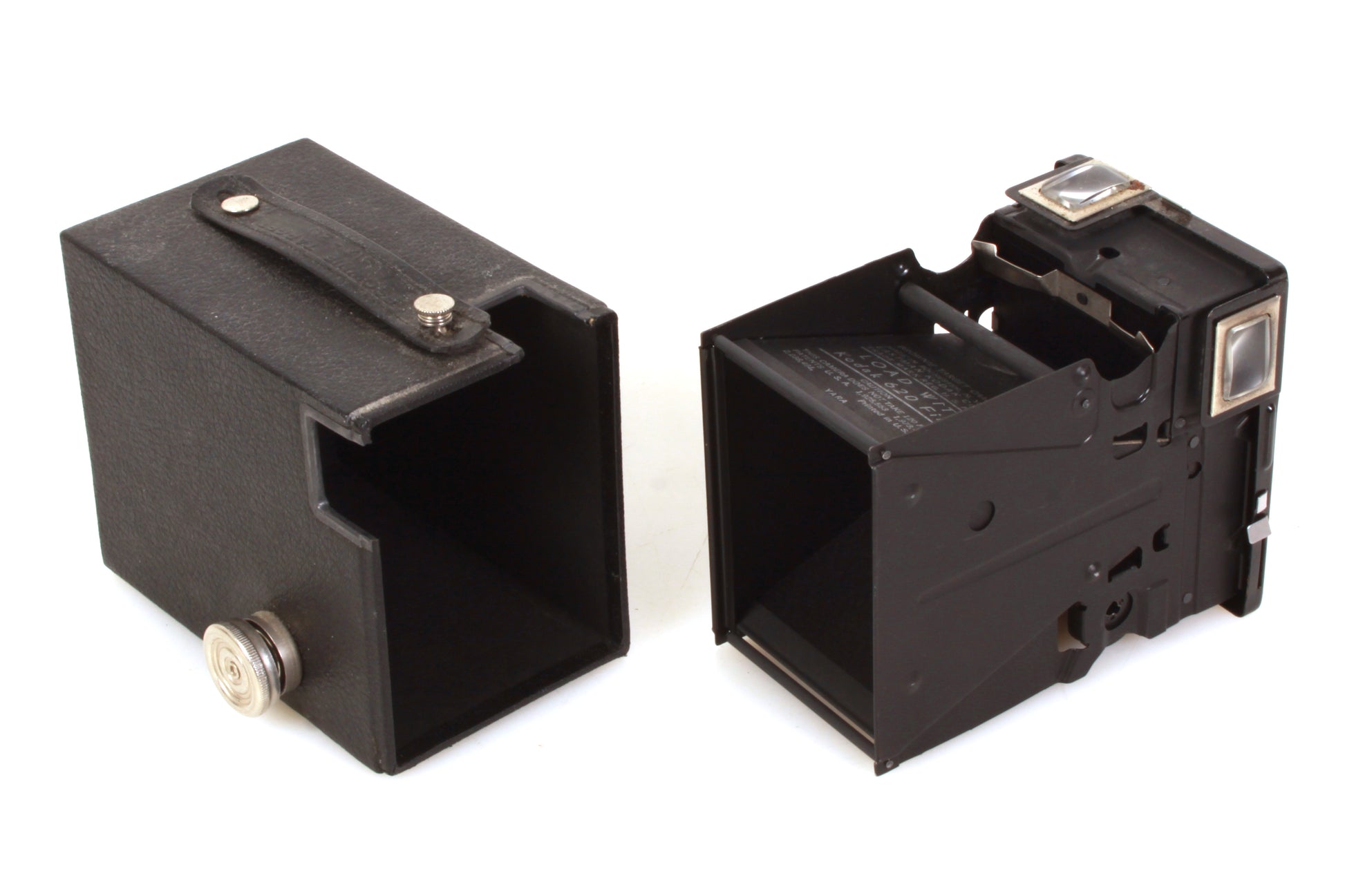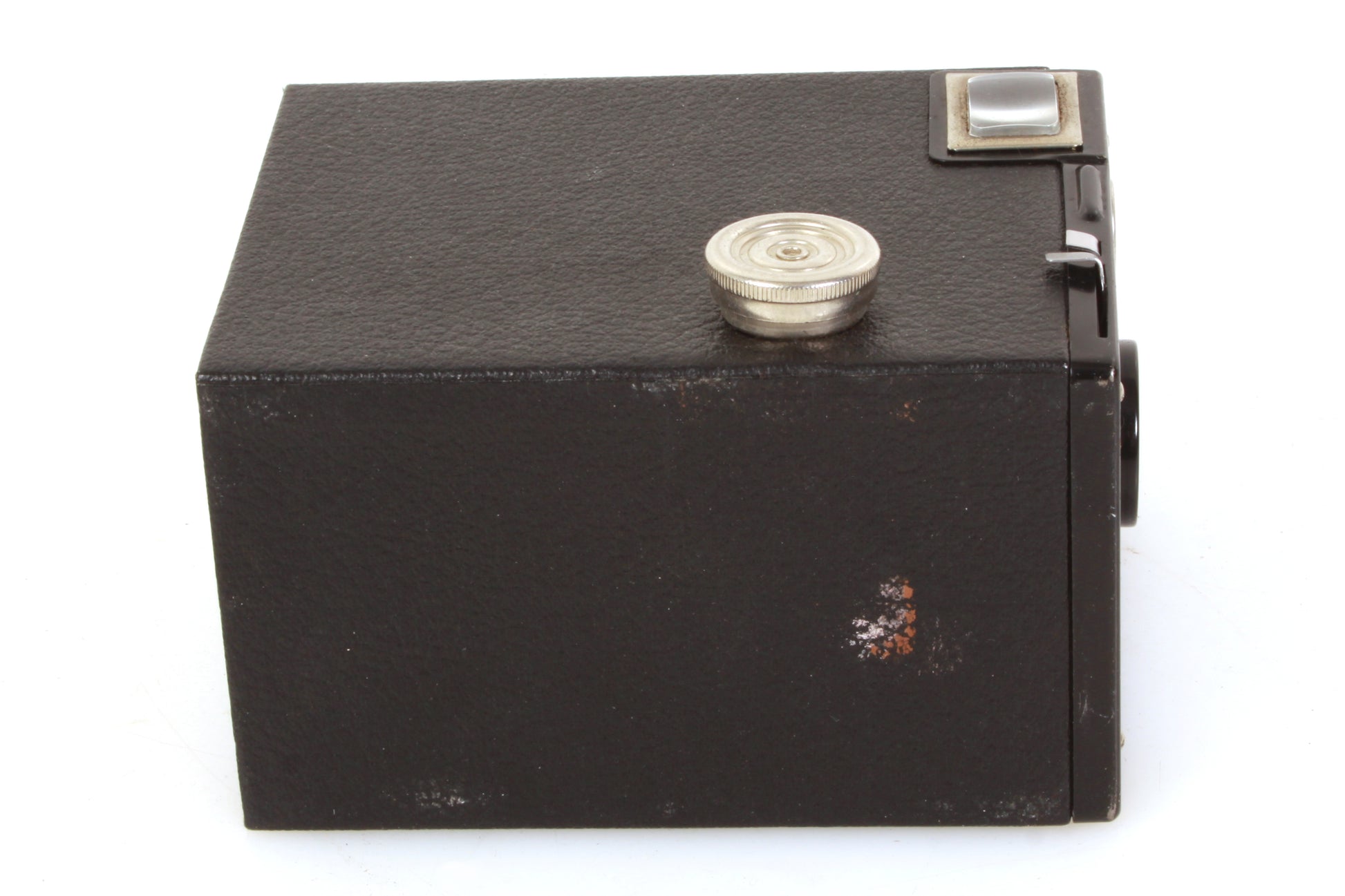 Kodak Brownie Target Six-20 camera. The shutter looks to be firing fine, although it has not been tested with film or for accuracy. Cosmetically it is in good vintage condition with some general wear and tear. There looks to be some dust present to the lens but no haze or scratches. The viewfinder has significant dust and haze. One of the mirrors at the front is out of place. Sold as is.