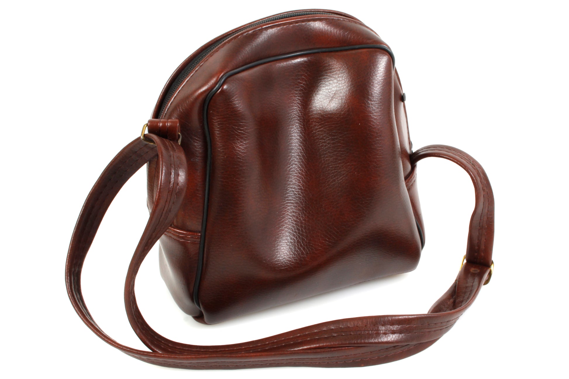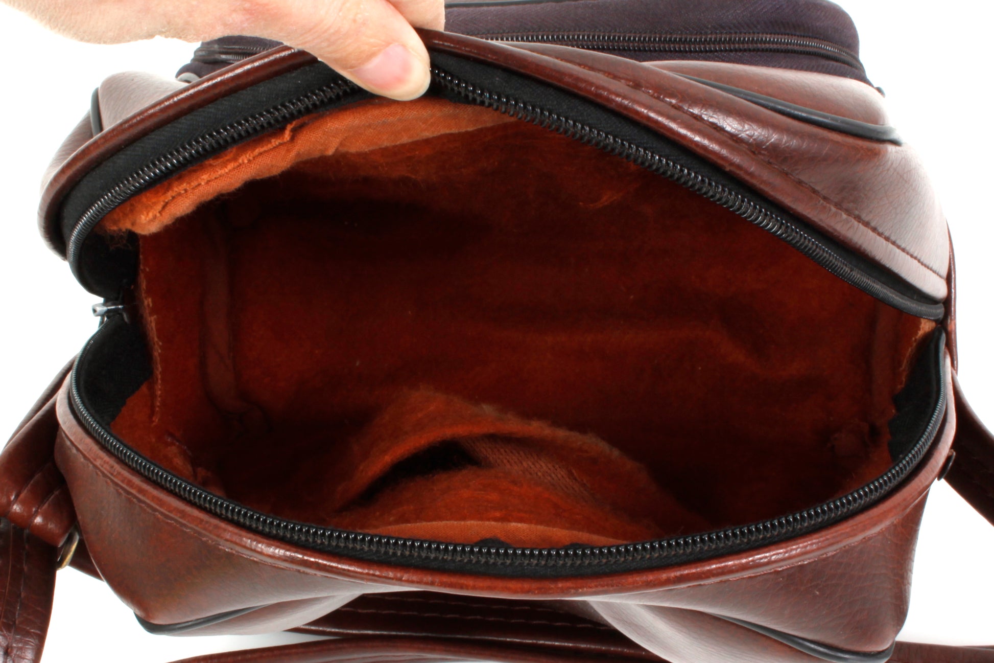 Kodak brown vinyl camera bag with strap. Overall measurements approximately 8 3/4 x 8 x 5 inches. Interior measurements approximately 8 1/4 x 8 x 3 1/4 inches. In good vintage condition with some marks, scuffs and general signs of use.