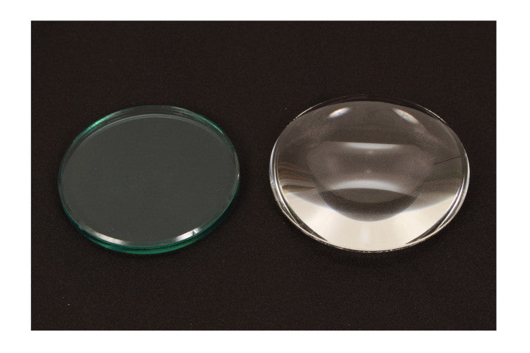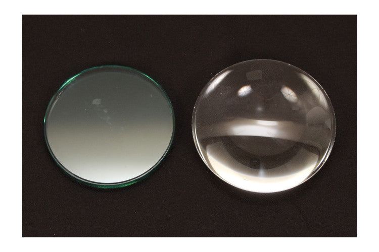 HEAT GLASS AND CONDENSER FOR KODAK CAROUSEL SLIDE PROJECTOR. THE HEAT GLASS MEASURES APPROXIMATELY 2 1/2 INCHES DIAMETER AND 1/4 INCH DEEP. THE CONDENSER IS CONVEX ON BOTH SIDES AND MEASURES APPROXIMATELY 2 3/4 INCHES DIAMETER. BOTH IN GOOD USED CONDITION WITH SOME LIGHT SCRATCHES AND SOME SMALL CHIPS TO THE EDGES.