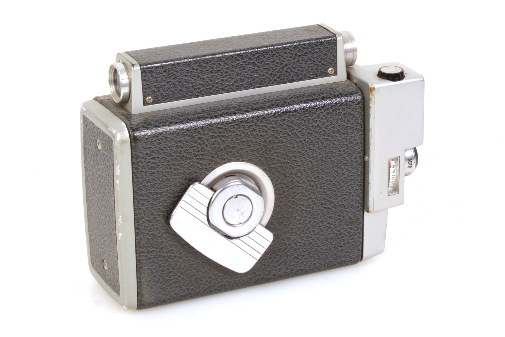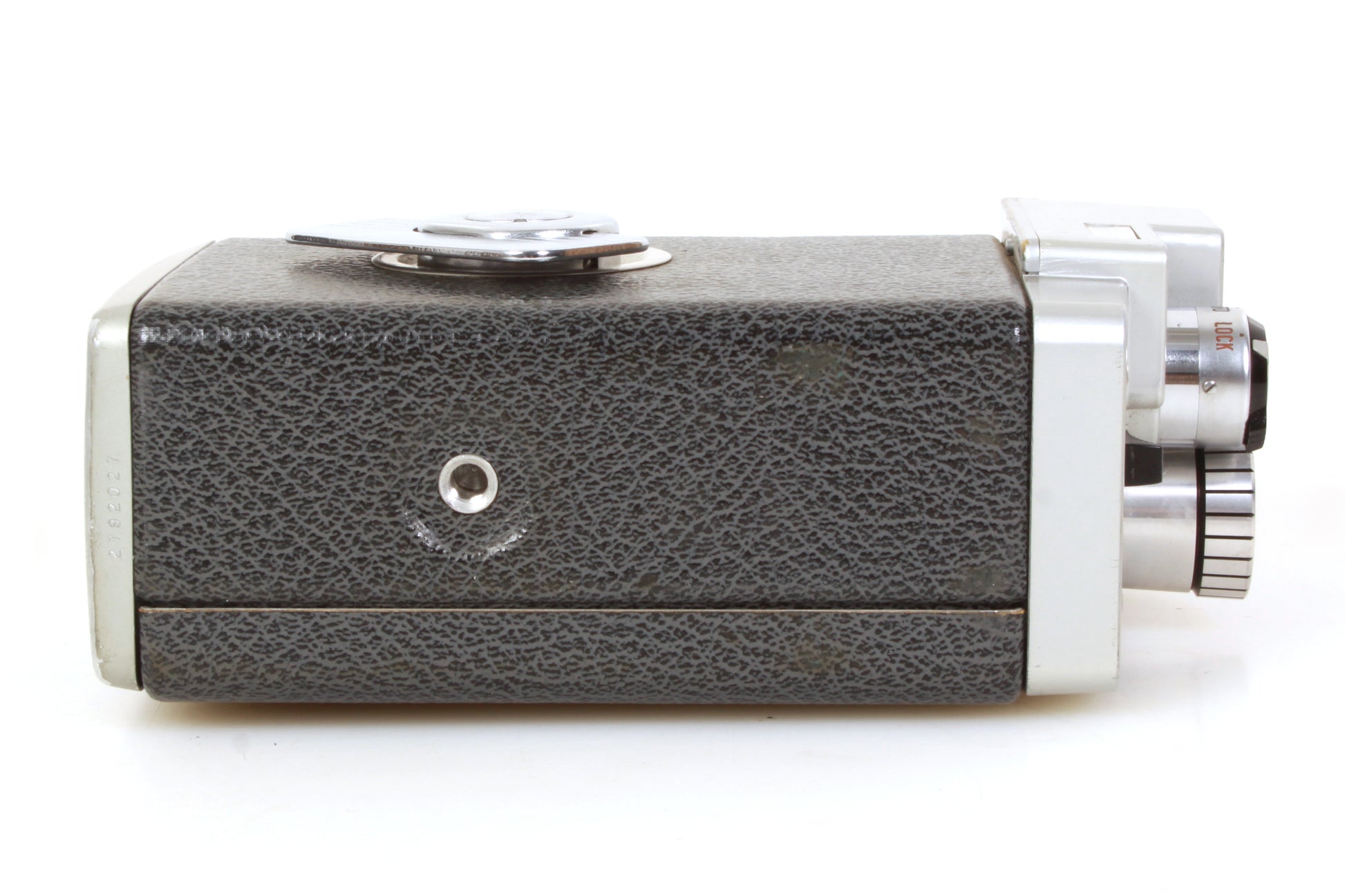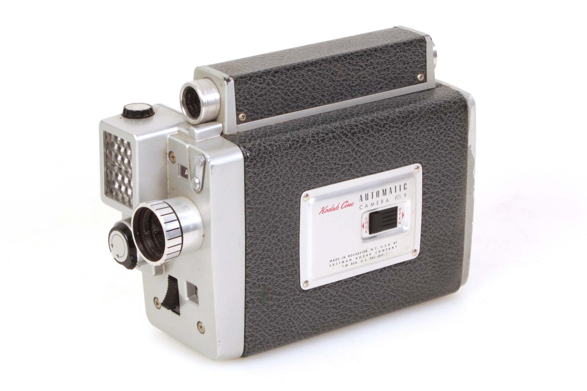 Kodak Cine Automatic Camera f/1.9. Looks to be in working order - the motor is working, although it has not been tested with film or for accuracy. Cosmetically the camera has some general wear and tear. The interior of the viewfinder seems to have dislodged and it is difficult to see through the viewfinder. There looks to be some dust present to the lens but no haze or scratches.