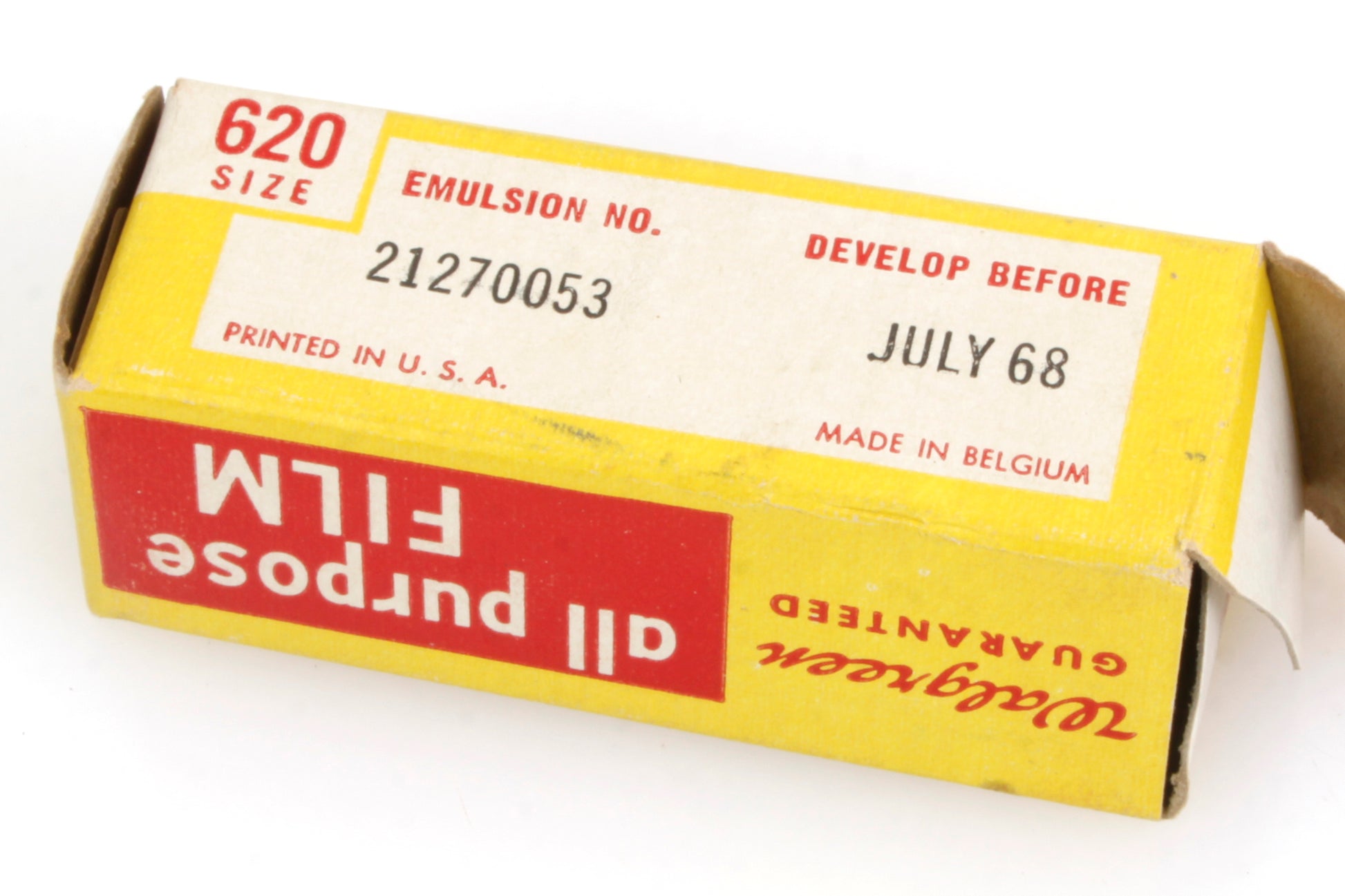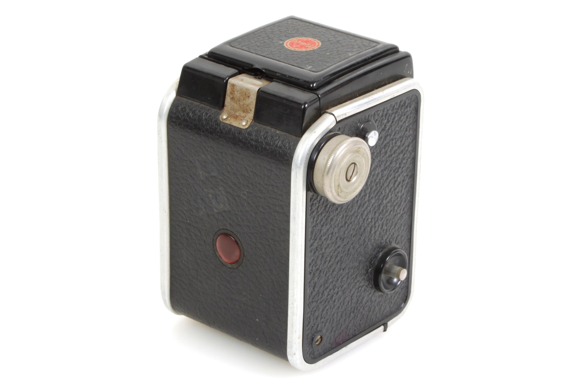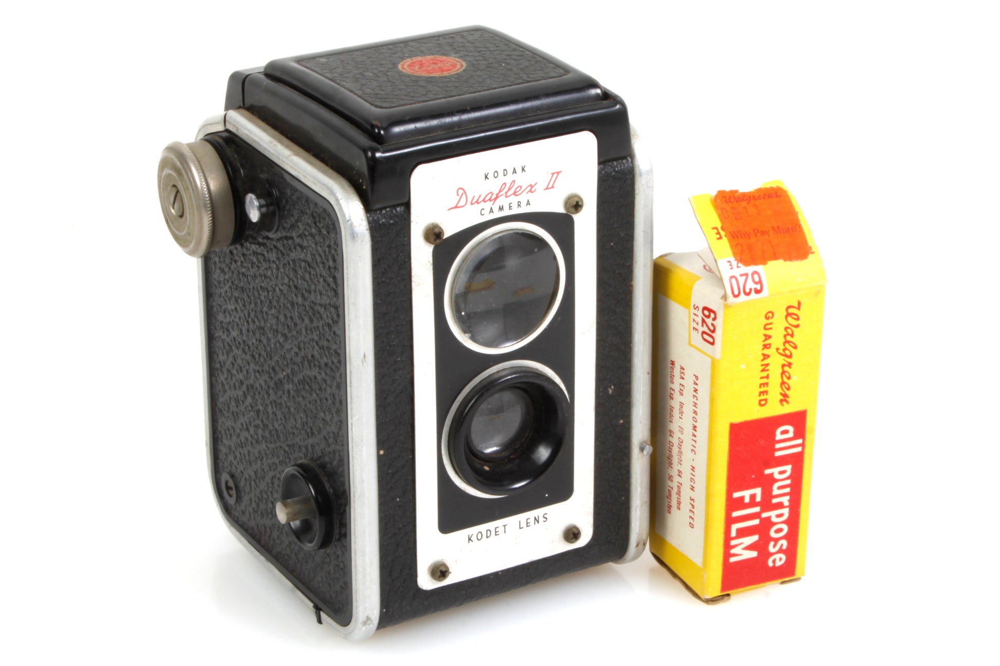 Kodak Duaflex II camera. It looks to be in working order - the shutter seems to fire fine on both settings, although it has not been tested with film or for accuracy. Cosmetically it is in good vintage condition with some general signs of age and use. There is dust, haze and fungus present to the lens but no scratches. There is dust and haze to the viewfinder but no cracks. Comes with one roll of Walgreen black & white 620 film. The develop before date was July 1968 so we cannot guarantee its condition or usability but it is still sealed in its original packaging.
