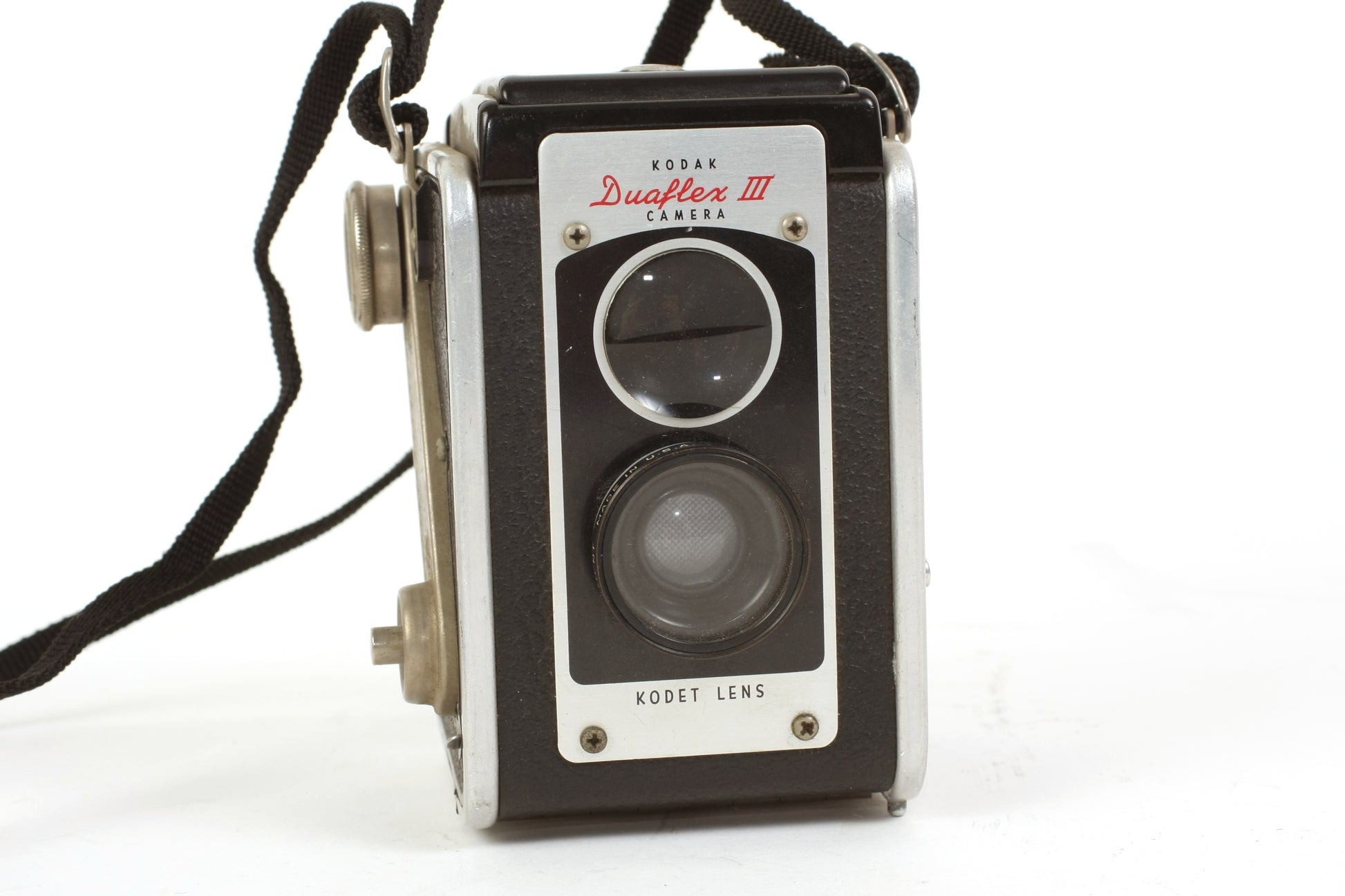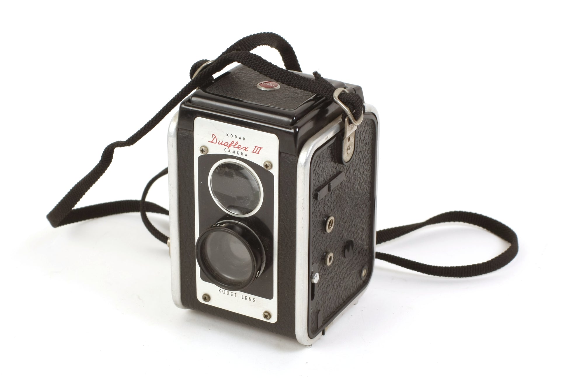 KODAK DUAFLEX III CAMERA WITH KODET LENS. COMES WITH NO. 6A CLOSE-UP ATTACHMENT AND KODALITE FLASHOLDER. THE SHUTTER SEEMS TO FIRE ON BOTH SETTINGS, ALTHOUGH IT HAS NOT BEEN TESTED WITH FILM OR FOR ACCURACY. COSMETICALLY THE CAMERA HAS SOME GENERAL SIGNS OF AGE AND USE. THERE LOOKS TO BE SOME DUST AND HAZE PRESENT TO THE LENSES BUT NO SCRATCHES. SOME DUST PRESENT TO THE VIEWFINDER BUT NO CRACKS. THE FLASH HAS NOT BEEN TESTED SO IT IS SOLD AS IS. COSMETICALLY THE FLASH IS IN GOOD VINTAGE CONDITION WITH SOME GENERAL MARKS AND SCRATCHES. THE BATTERY COMPARTMENT IS CLEAN AND FREE OF CORROSION.
