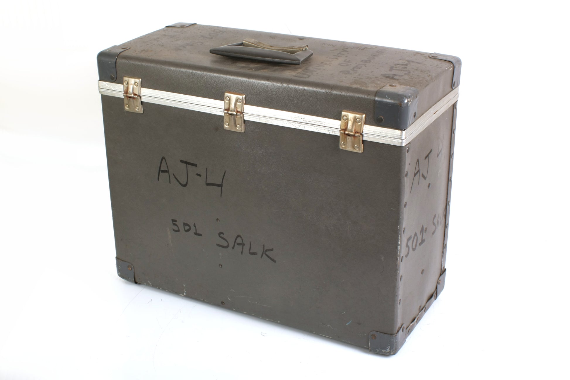 CAMERA CASE WITH TOP HANDLE. MEASURES APPROXIMATELY 18 1/2 X 14 1/2 X 8 INCHES. THERE ARE SOME DIVIDERS TO THE INTERIOR. IT LOOKS LIKE SOME OF THE FOAM INSERTS HAVE BEEN REMOVED BUT SOME RESIDUE REMAINS. THERE IS SOME GENERAL WEAR AND TEAR TO THE CASE, HANDWRITING TO THE EXTERIOR, AND SOME AREAS OF RUST.