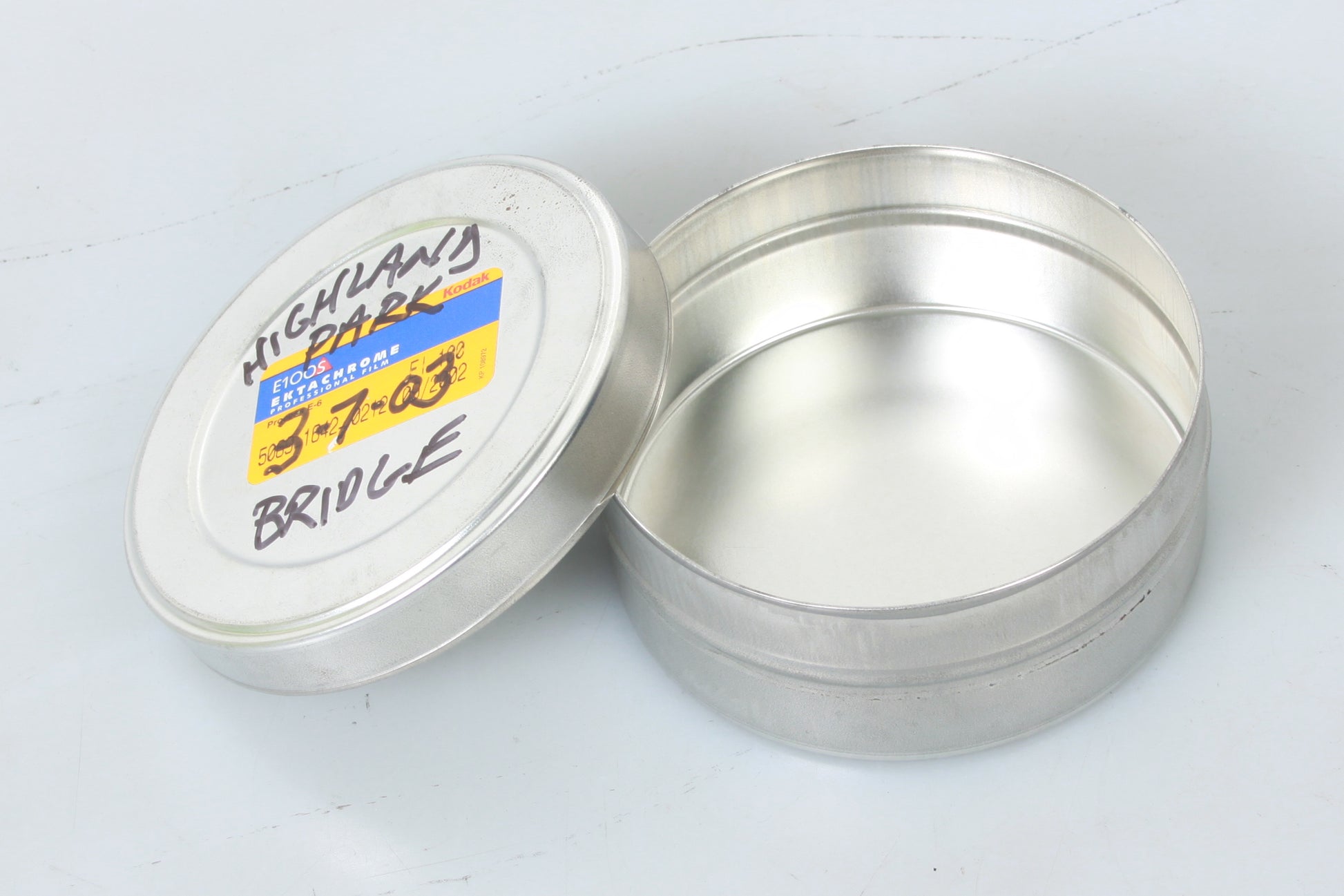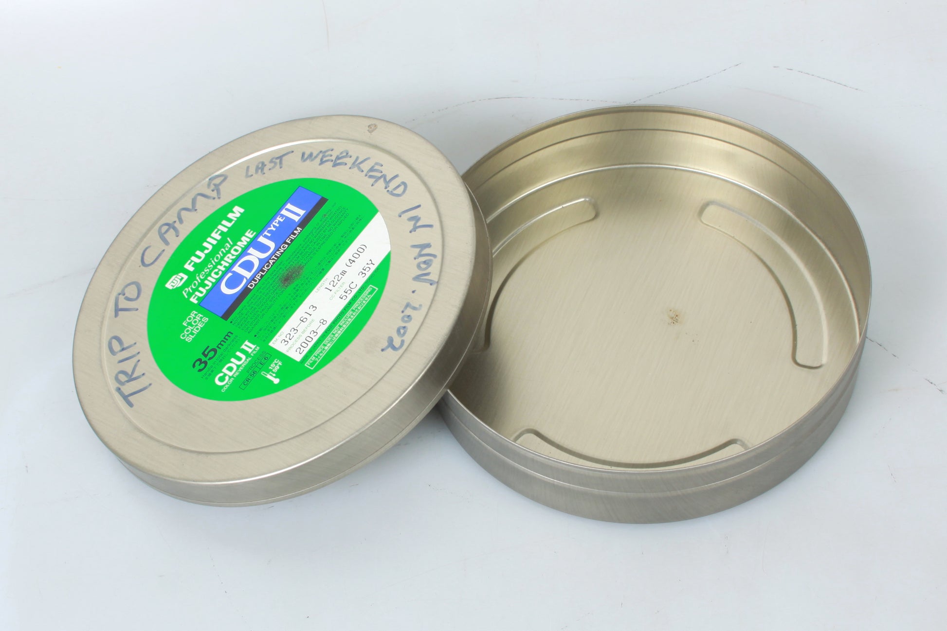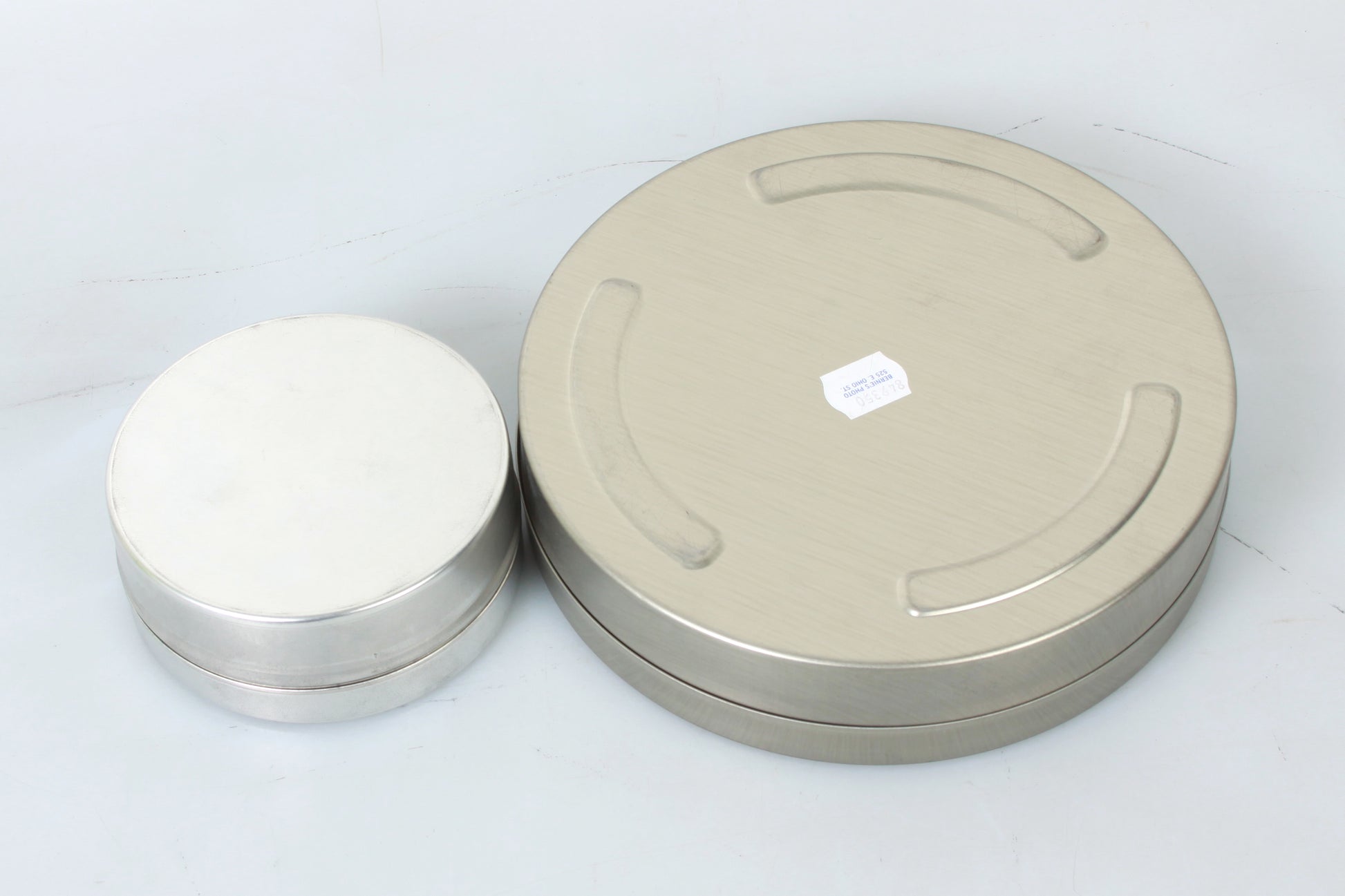 LOT OF TWO VINTAGE METAL 35MM FILM CANS. THE SMALLER ONE MEASURES APPROXIMATELY 1 11/16 INCHES DEEP AND 4 1/16 INCHES DIAMETER, AND THE LARGER ONE MEASURES APPROXIMATELY 1 11/16 INCHES DEEP AND 7 1/8 INCHES DIAMETER. IN GOOD VINTAGE CONDITION. THERE ARE SOME MARKS/SCRATCHES, AND SOME HANDWRITING.