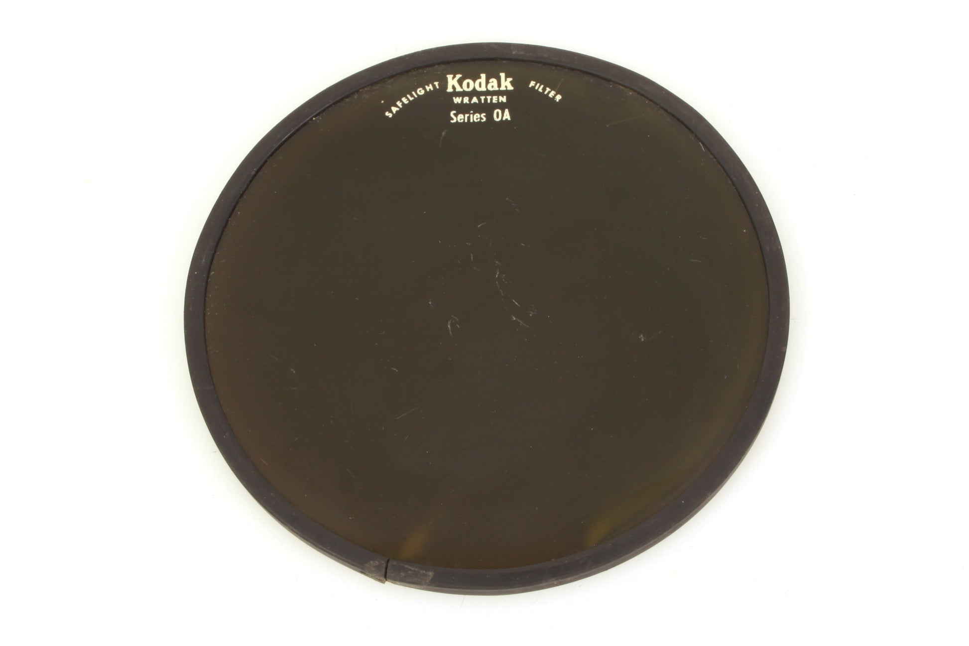 Wratten Safelight filter series 0A. Measures approximately 5 1/2 inches diameter. Glass filter with rubber trim. In good used condition. There are some scratches to the glass.