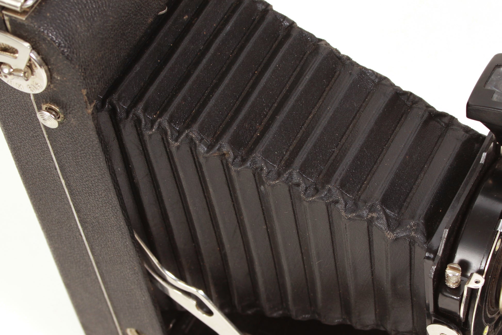 Junior Six-16 Series II camera with f6.3 126mm lens. The shutter seems to be firing fine on all settings except T which doesnt stay open. The camera has not been tested with film or for accuracy. Aperture movement is fine. Cosmetically the camera has some general signs of age and use. There is some wear to the bellows but there are no visible tears or holes. There is some dust and haze present to the lens but no scratches. Comes with its original box. There is some damage to the box.