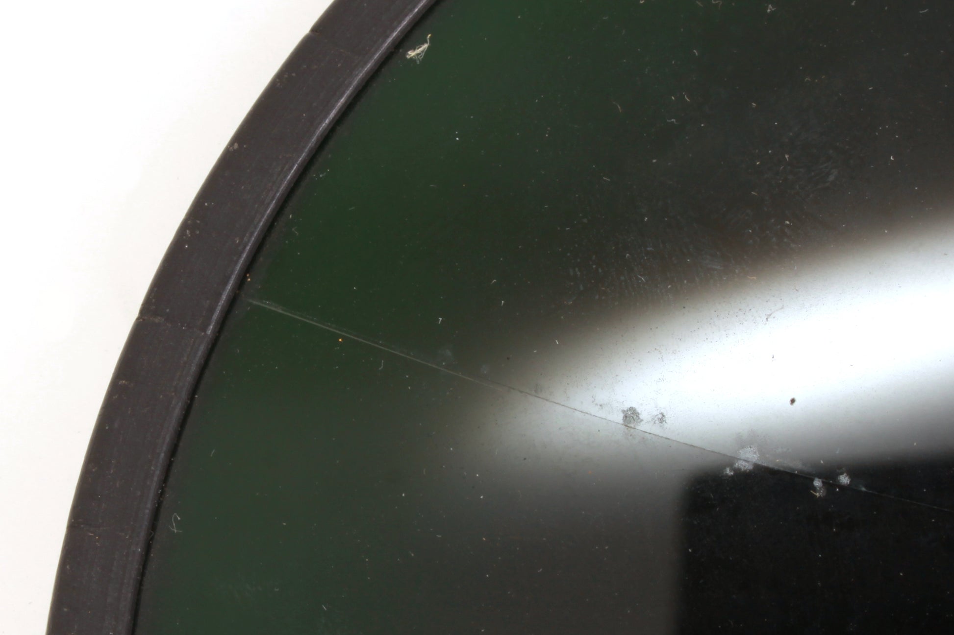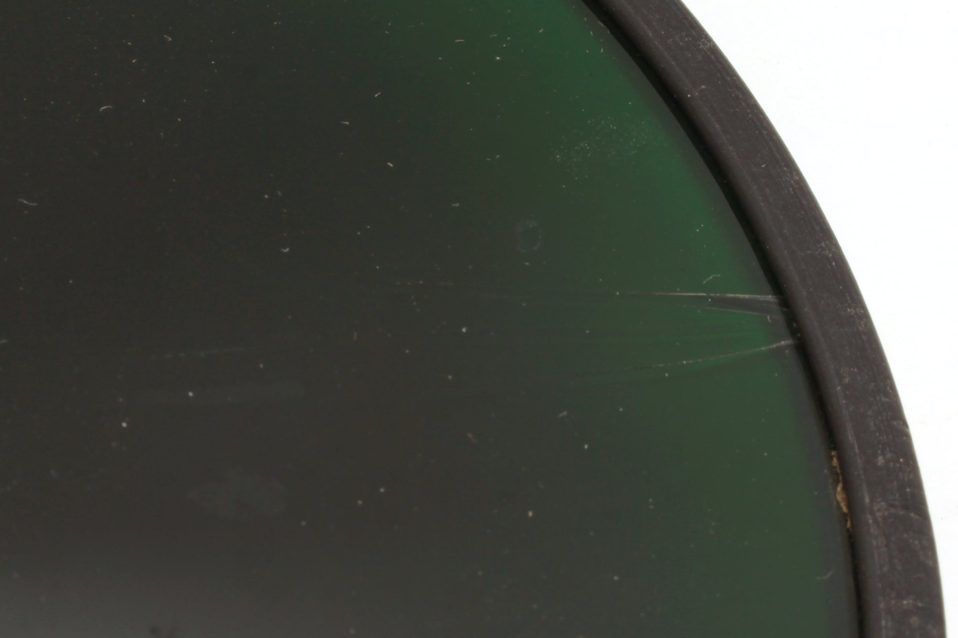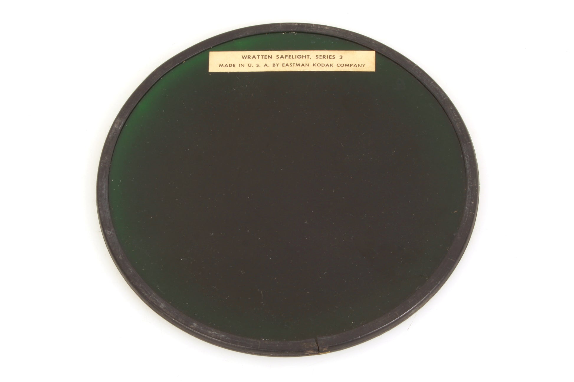 Wratten Safelight filter series 3. Measures approximately 5 1/2 inches diameter. Glass filter with rubber trim. There are some scratches to the glass and some cracking across the back of the glass.