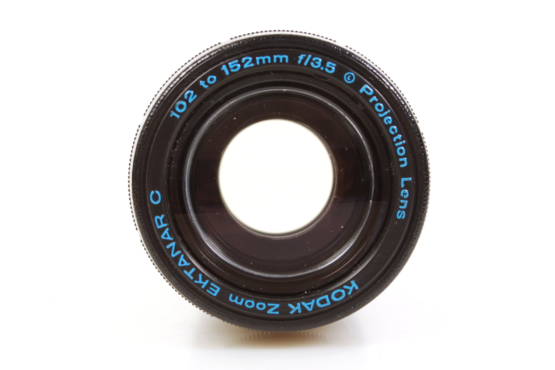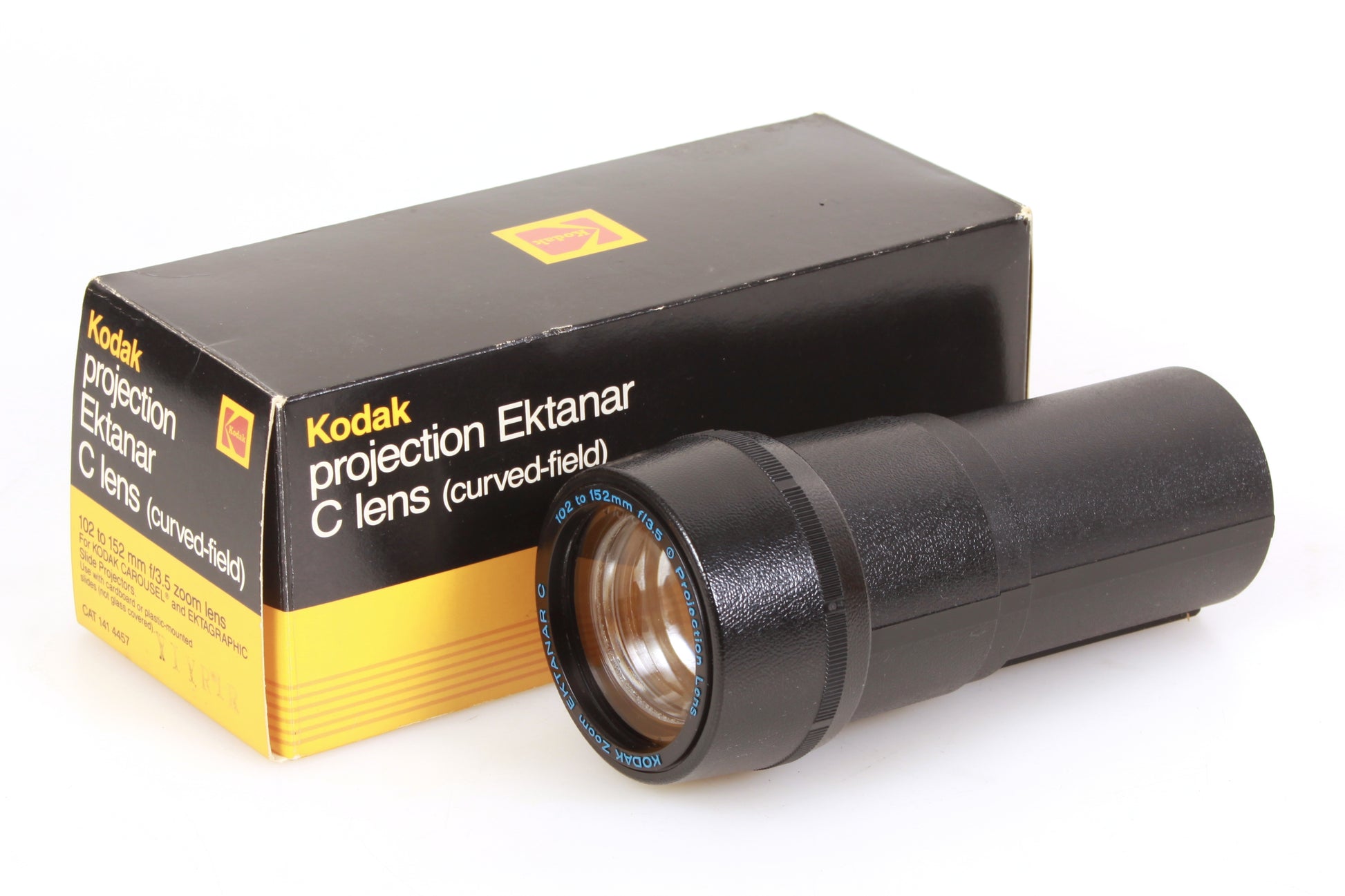 Projection Ektanar C lens (curved-field) 102 to 152 mm f/3.5 zoom lens for Carousel and Ektagraphic slide projectors. There is some dust and haze present to the lens but no scratches. The barrel is in very good cosmetic condition. Comes with original box.
