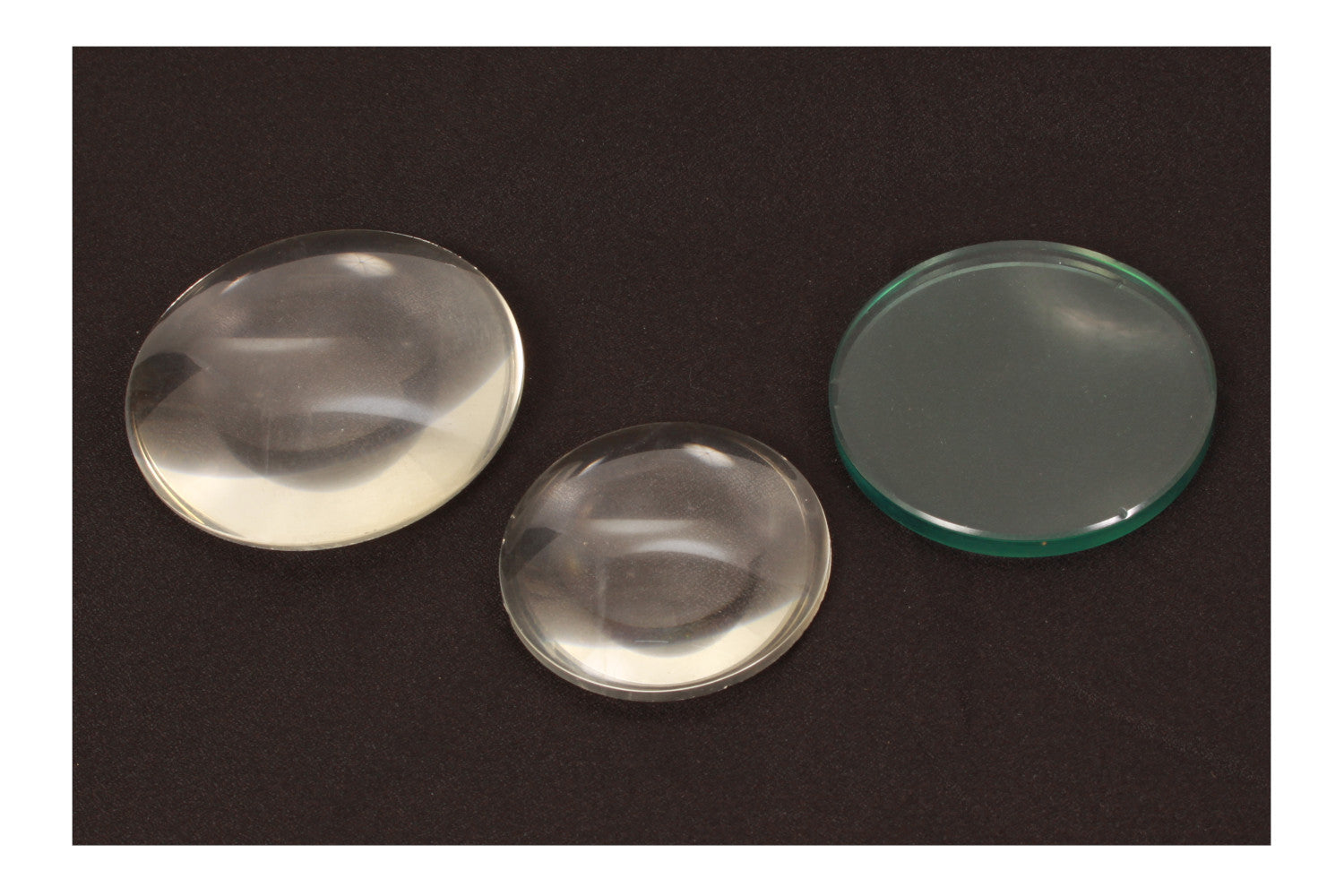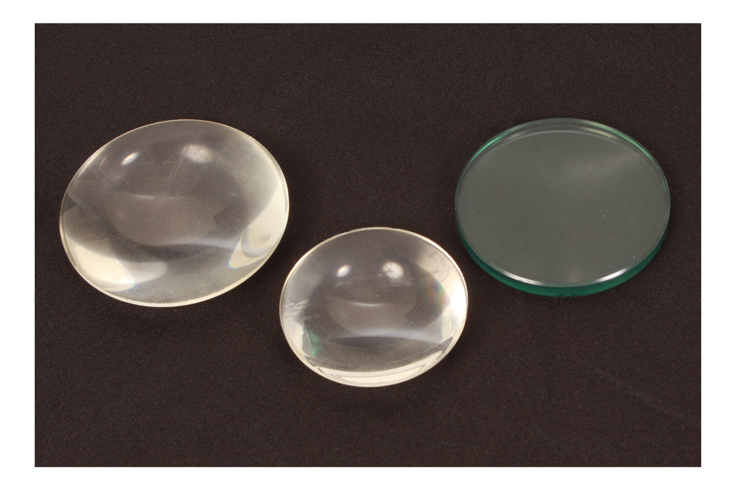 Slide projector heat glass and two condensers. The heat glass measures approximately 2 1/2 inches diameter and 1/4 inch deep. Both condensers are convex. The larger condenser measures approximately 2 3/4 inches diameter. The smaller condenser measures approximately 2 1/16 inches diameter. They are all in good used condition with some scratches and some small chips to the edges.