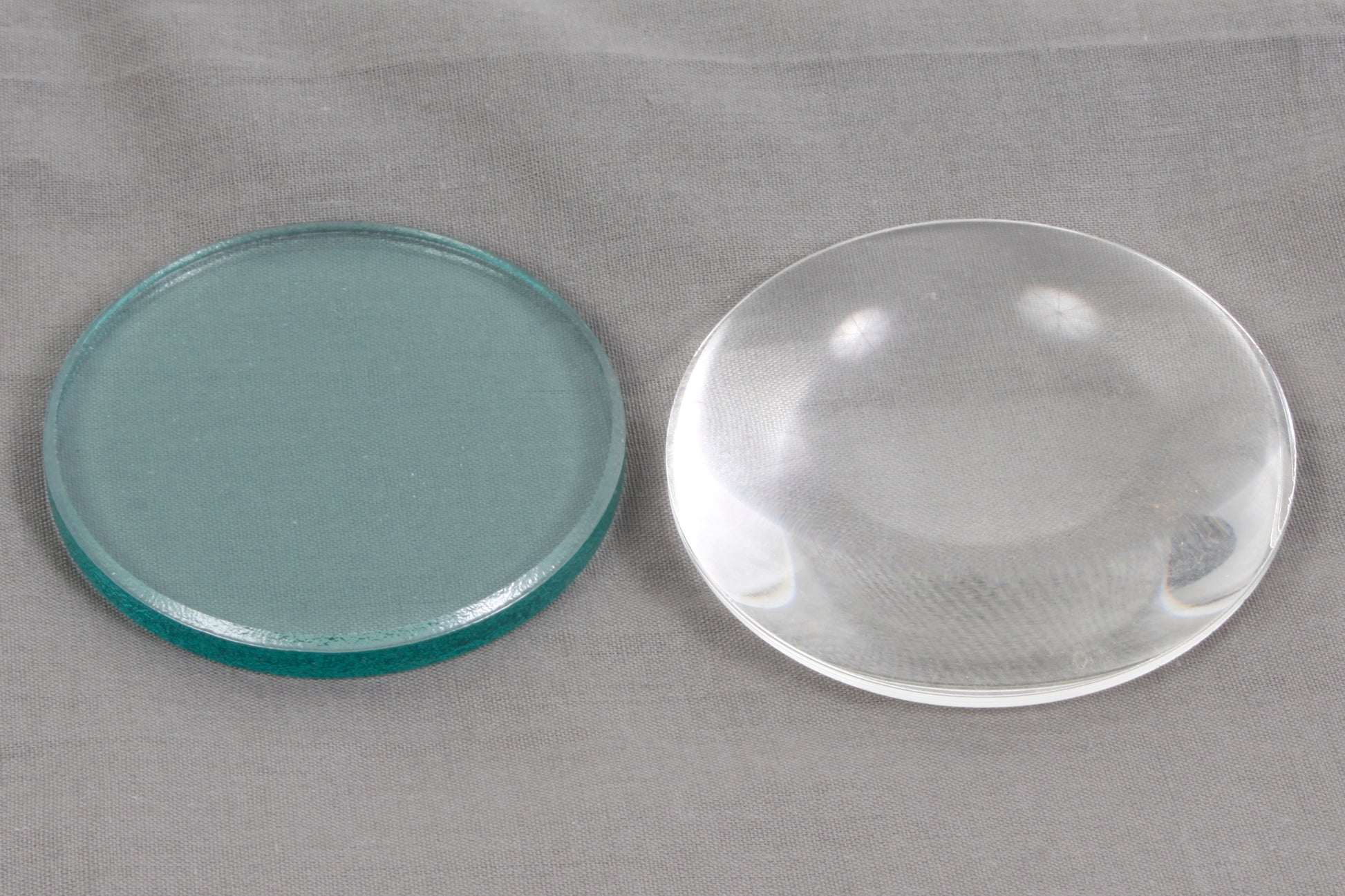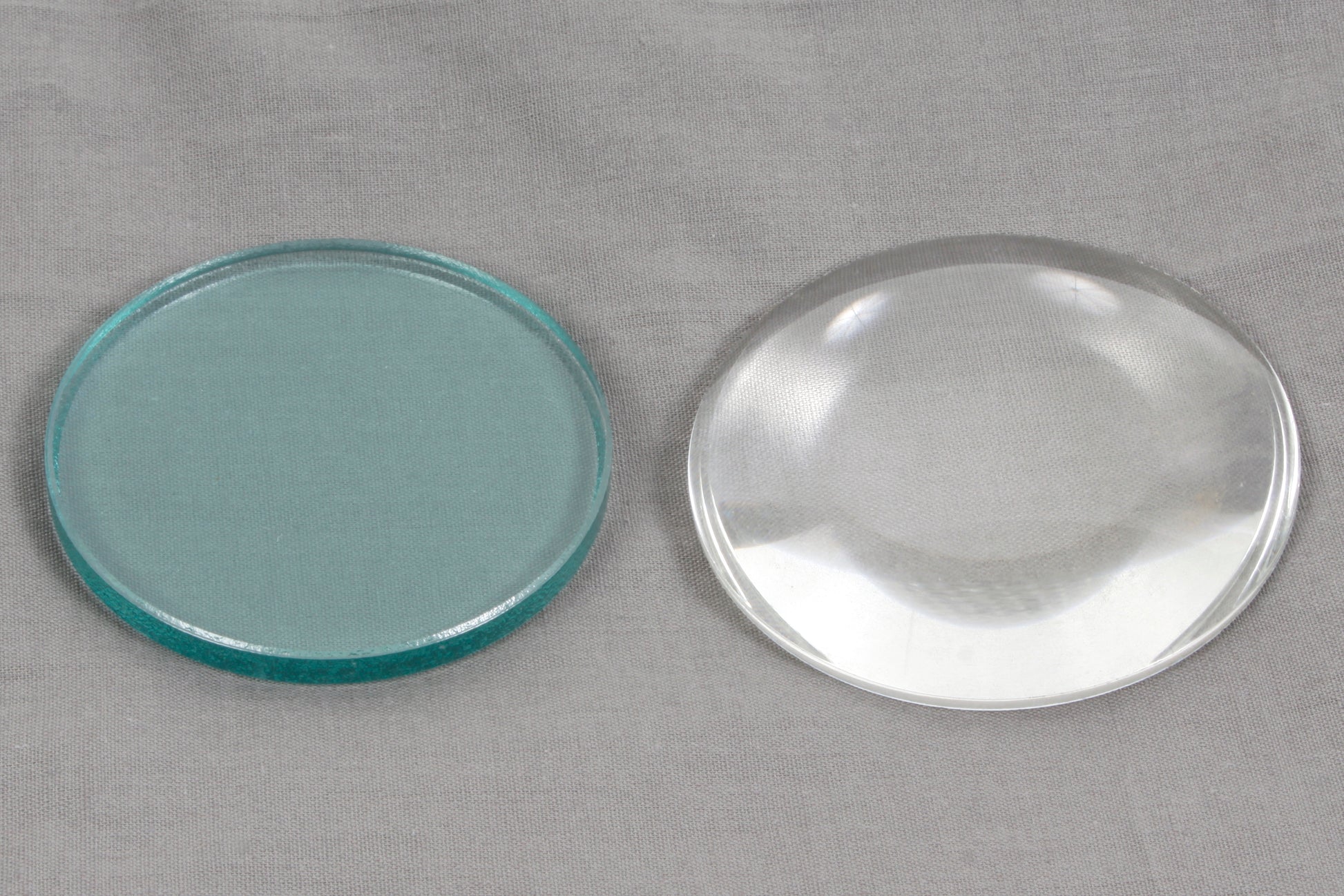 Kodak slide projector condenser & heat glass. The heat glass measures approximately 2 1/2 inches diameter and 1/4 inch deep. The condenser is convex on both sides and measures approximately 2 3/4 inches diameter. Both in good vintage condition with some scratches but no chips or cracks.