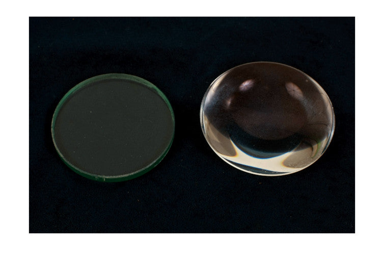 KODAK HEAT GLASS AND CONDENSER. THE HEAT GLASS MEASURES APPROXIMATELY 2 1/2 INCHES DIAMETER AND 1/4 INCH DEEP. THE CONDENSER IS CONVEX ON BOTH SIDES AND MEASURES APPROXIMATELY 2 3/4 INCHES DIAMETER. BOTH IN GOOD USED CONDITION WITH SOME LIGHT GENERAL SIGNS OF USE BUT NO MAJOR DAMAGE.