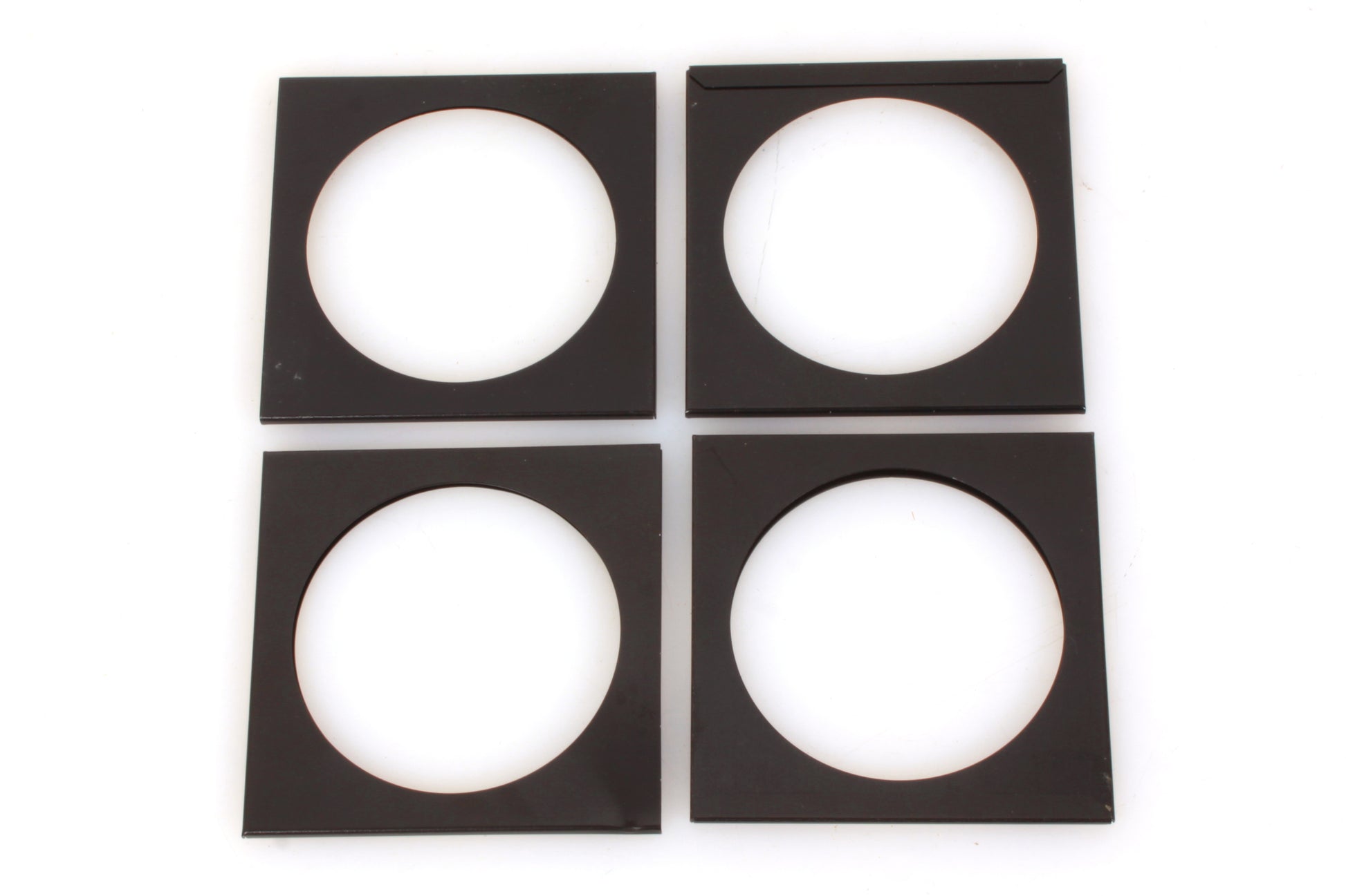 Set of four metal Wratten gelatin filter frame holders. Overall size 3 x 3 inches. Hole diameter approximately 2.4 inches / 62mm. In very good condition. Some light scratches.