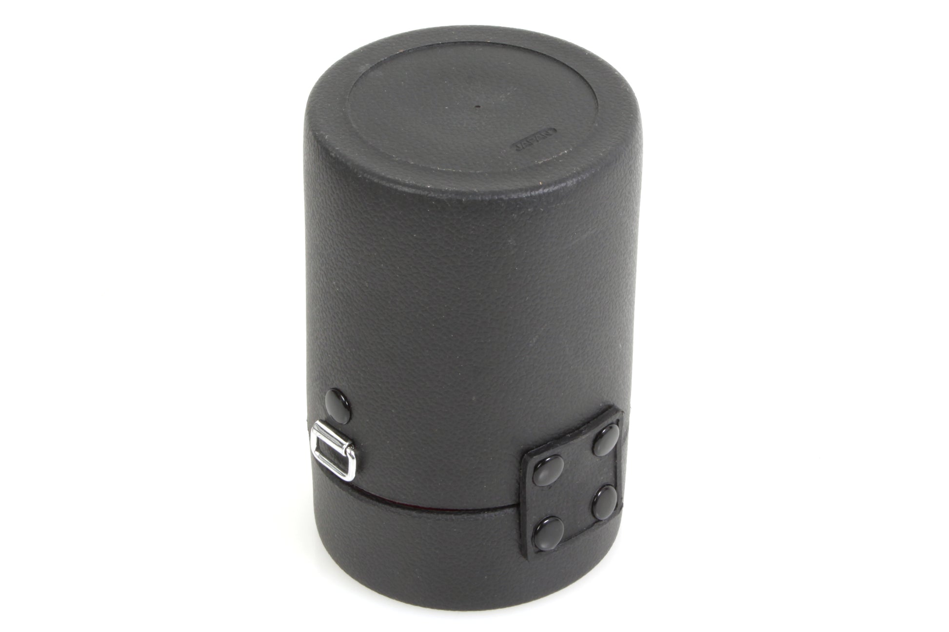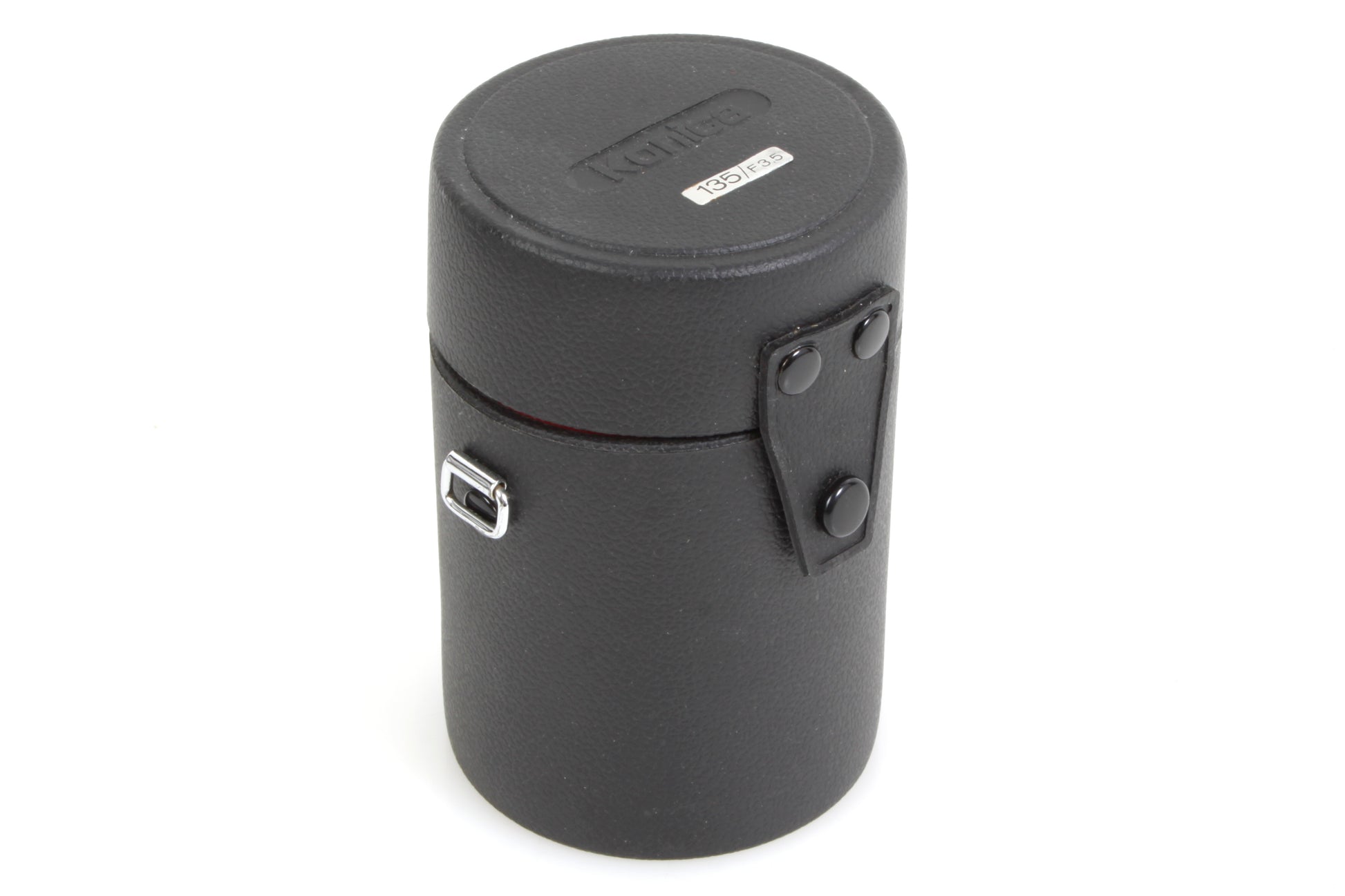 Konica 135/f3.5 black lens case. Exterior measurements approximately 4 3/4 inches tall and 3 inches diameter. Interior measurements approximately 3 1/2 inches tall and 2 1/2 inches diameter. In very good vintage condition with some light signs of use.