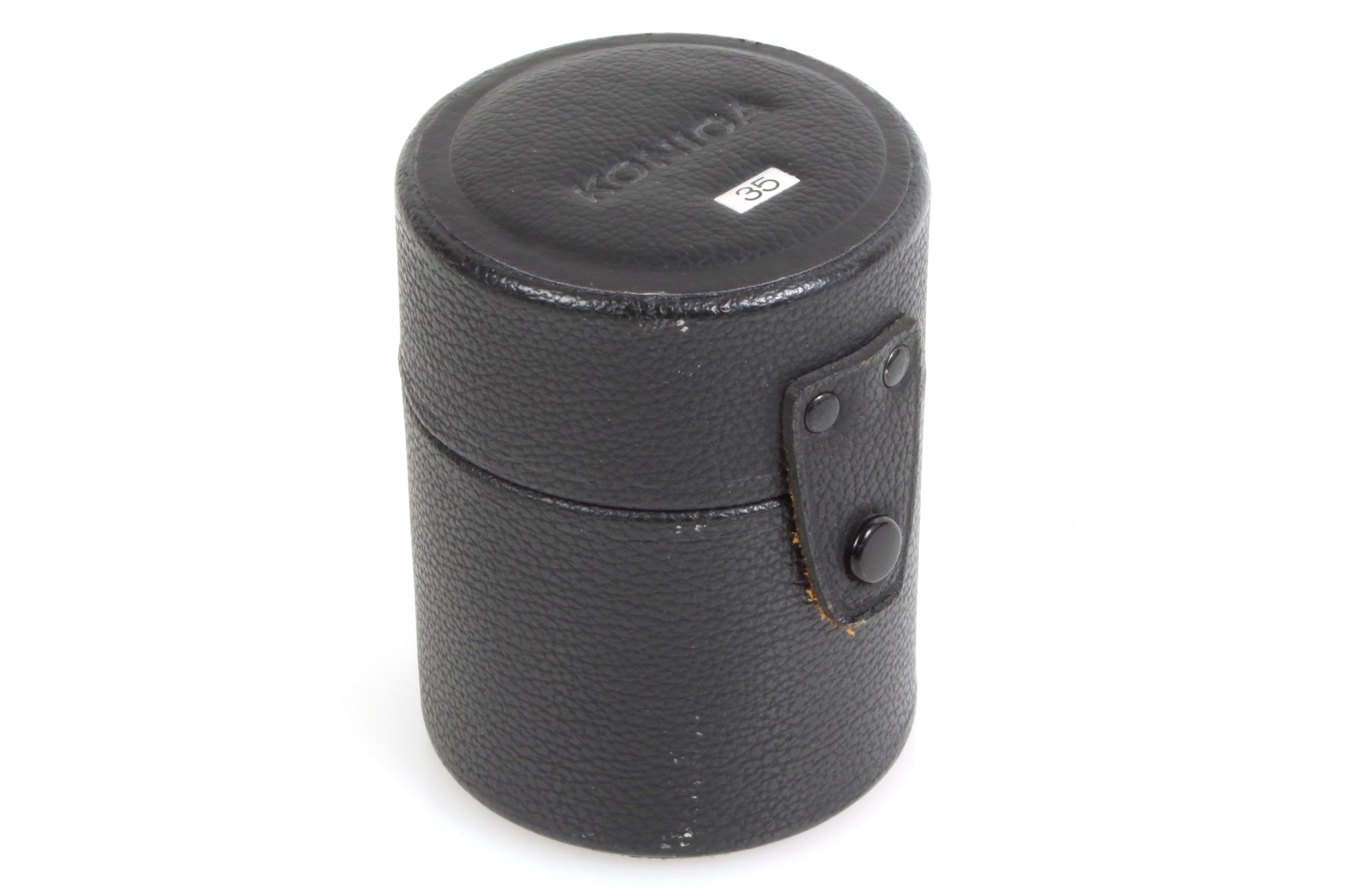 Konica 35 black lens case. Exterior measurements approximately 4 inches tall and 3 inches diameter. Interior measurements approximately 2 3/4 inches tall and 2 1/2 inches diameter. In very good vintage condition with some light signs of use.