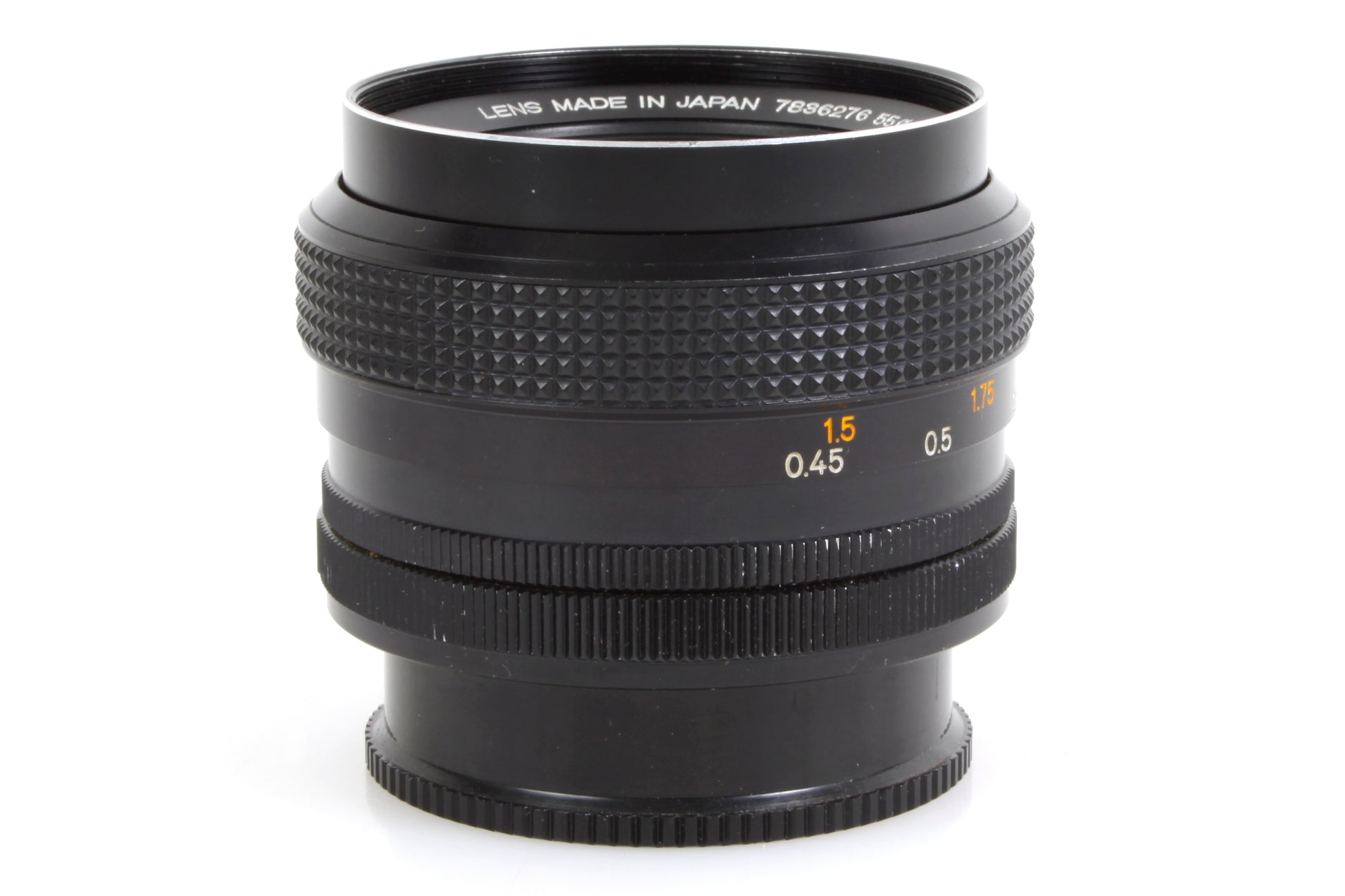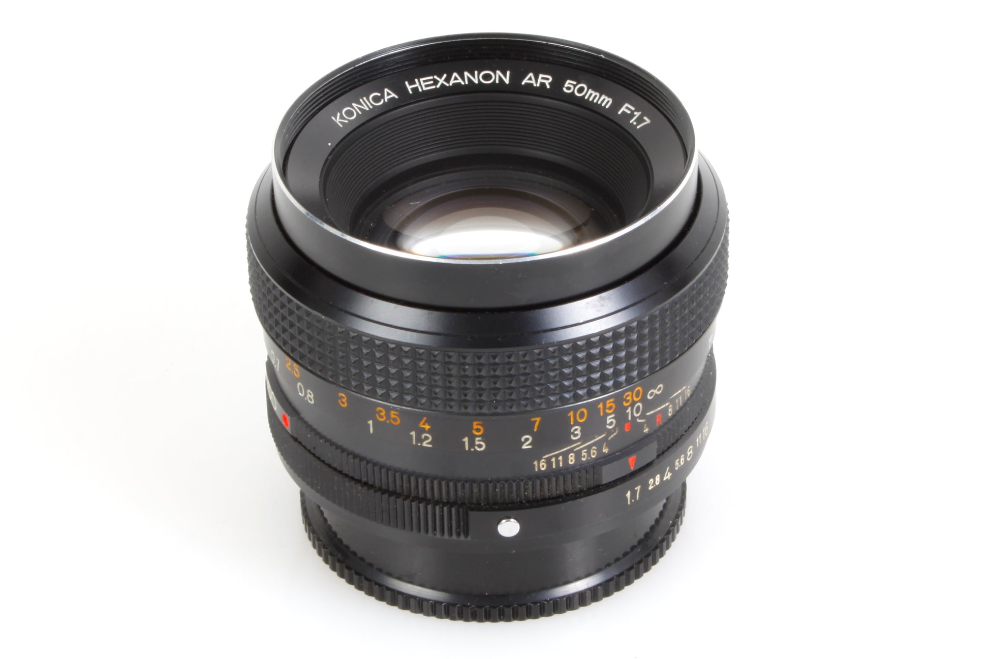 Konica Hexanon AR 50mm 1:1.7 lens. There is some dust, haze and fungus present to the lens but no scratches. The barrel is in very good cosmetic condition with light signs of use. Movement is fine. Comes with rear lens cap.