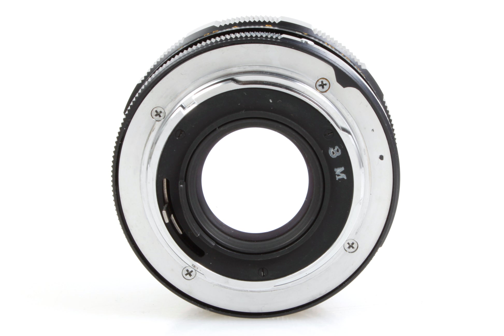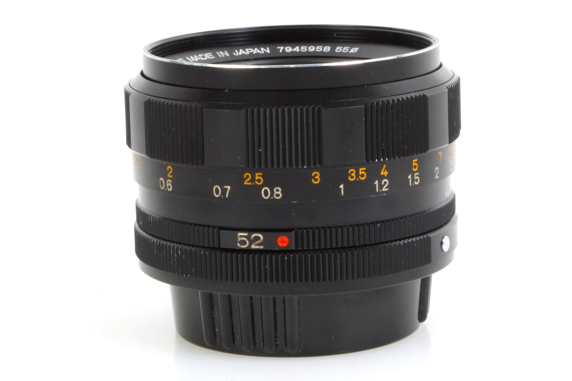 Konica Hexanon AR 52mm F1.8 lens. There is some dust and haze present to the lens but no fungus or scratches. The barrel is in very good cosmetic condition with light signs of use. Movement is fine. Comes with rear lens cap. The cap is a little loose.