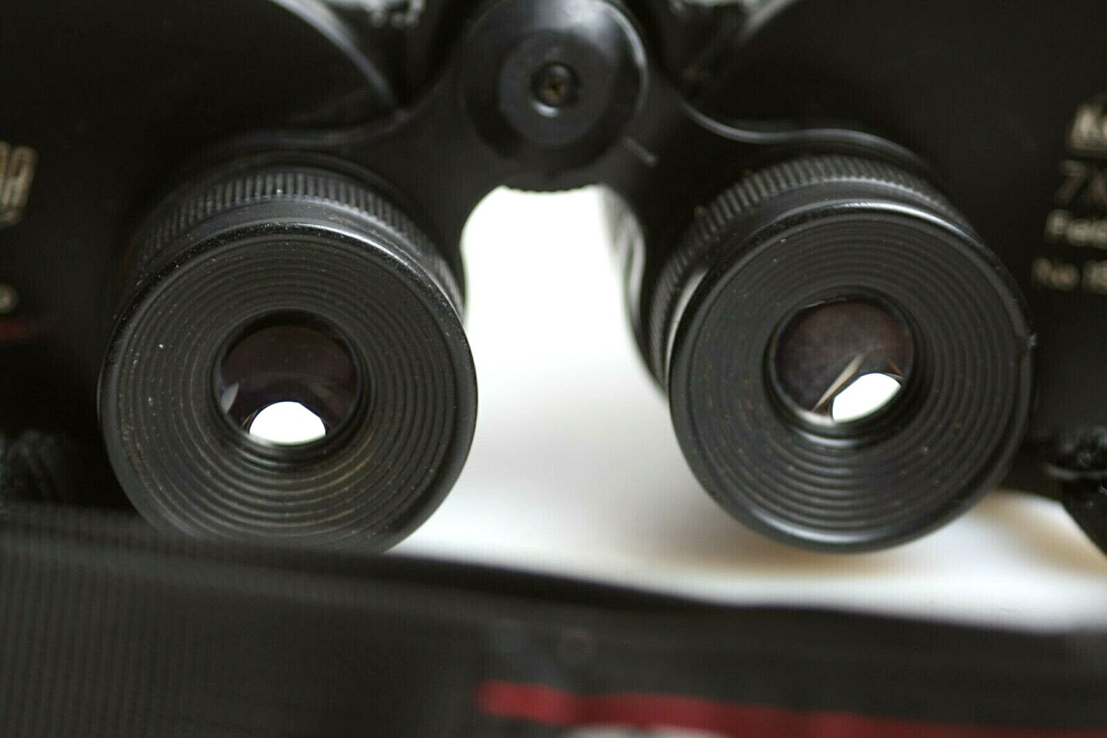 Very good cosmetic condition with some cracked missing grip on the left inner barrel. Radial scratches on lenses.