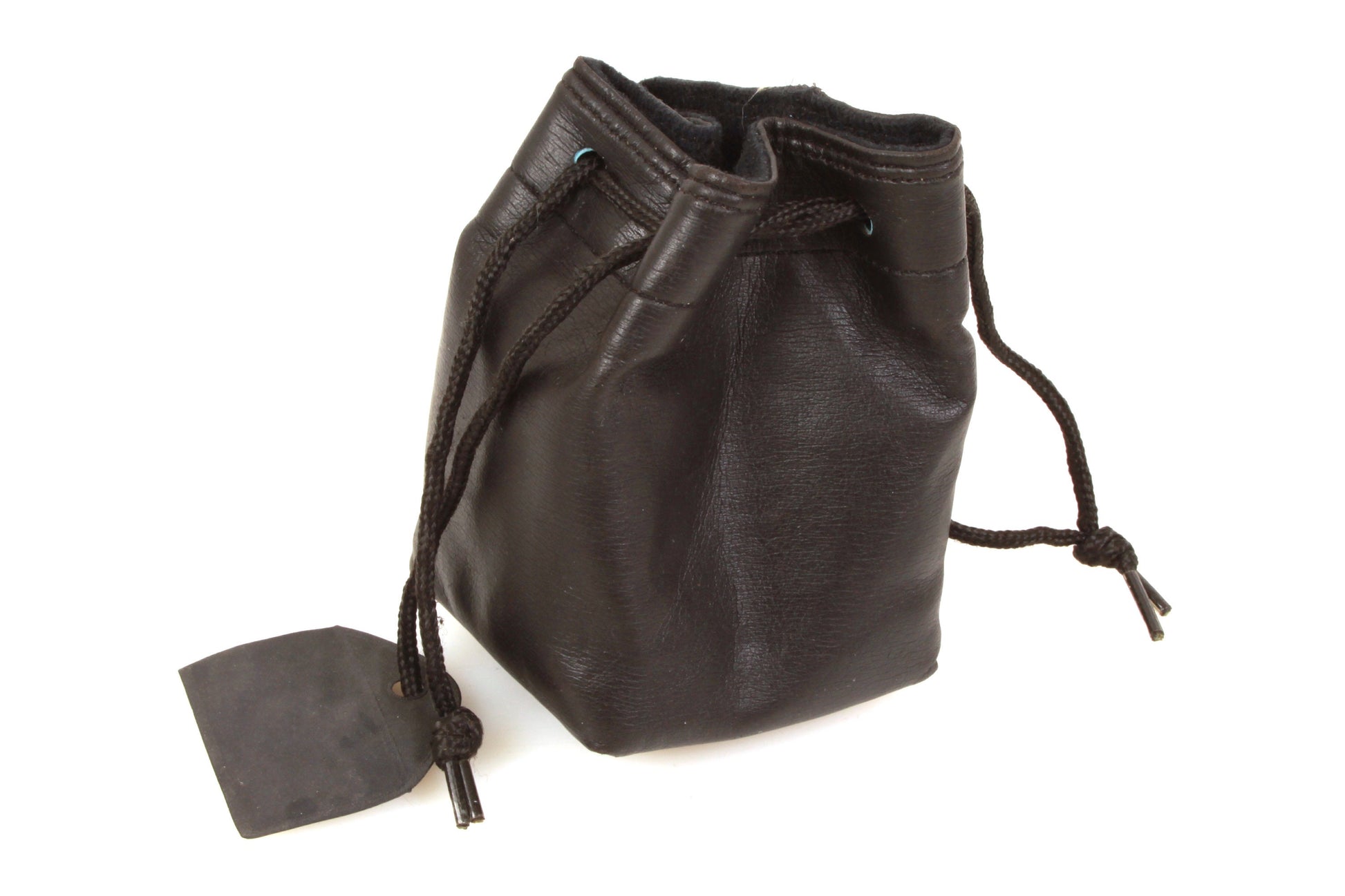 Unbranded black lens case with drawstring closure. Measures approximately 4 1/4 inches tall x 3 inches wide x 3 inches deep. In good cosmetic condition with some general signs of use.