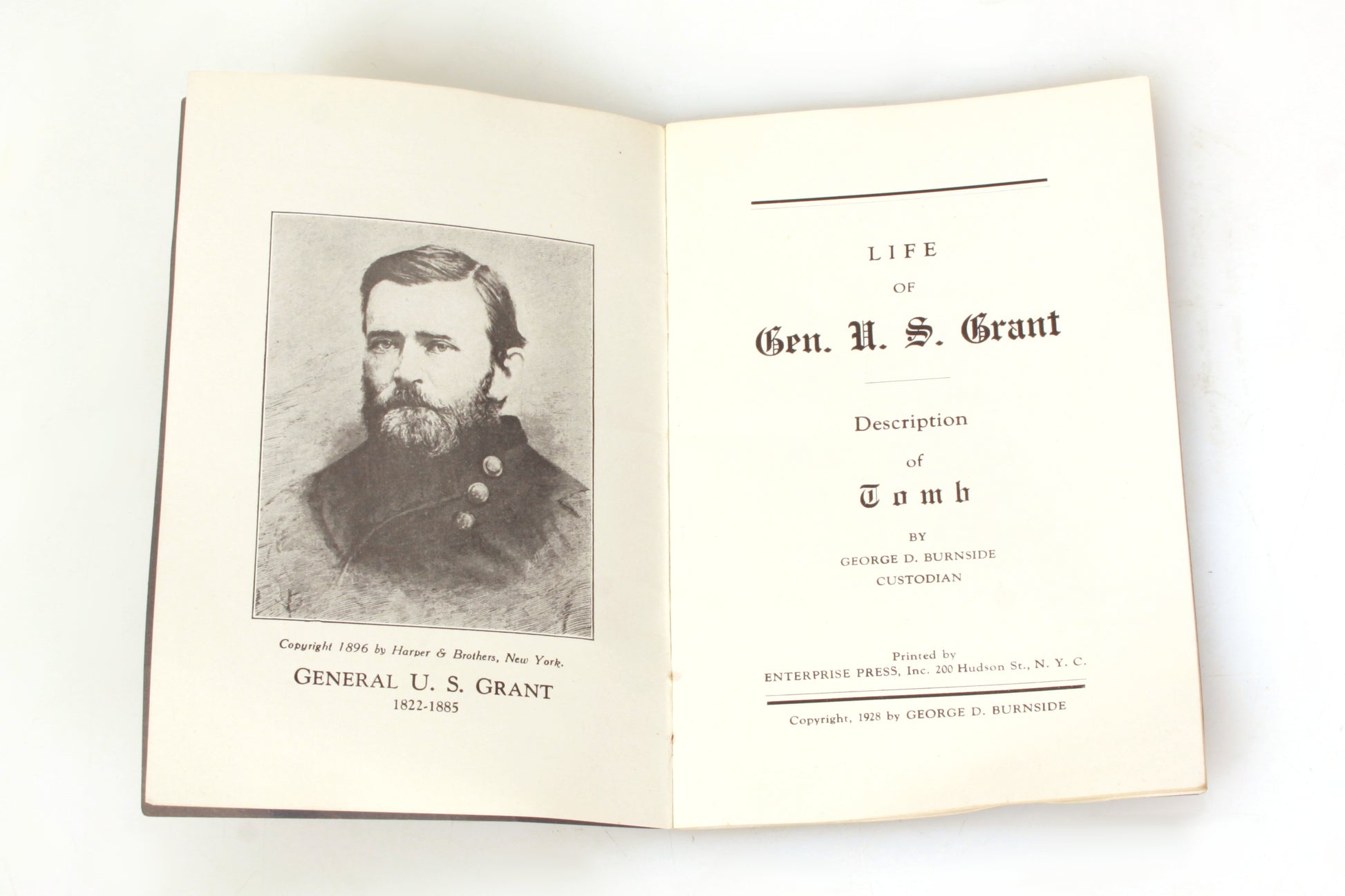 Life of General U.S. Grant Description of Tomb by George D. Burnside. Copyright 1928. 20 pages. There is some significant creasing, some significant fading to the cover, some yellowing to the pages, but the contents are still clean and readable.
