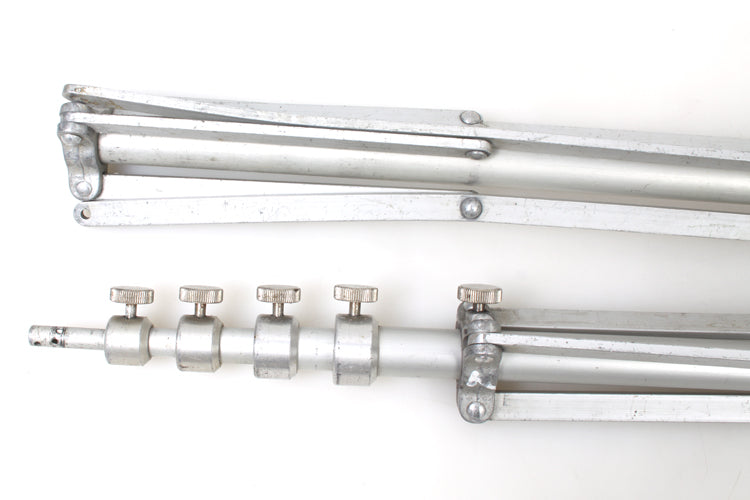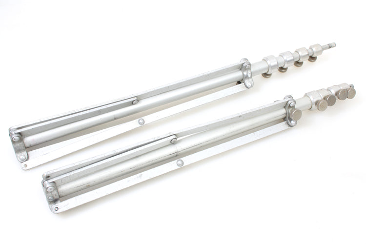 SET OF TWO LIGHT STANDS. EACH ONE MEASURES APPROXIMATELY 21 1/2 INCHES WHEN FOLDED AND 75 INCHES FULLY EXTENDED. THERE ARE MARKS AND SCRATCHES THROUGHOUT.
